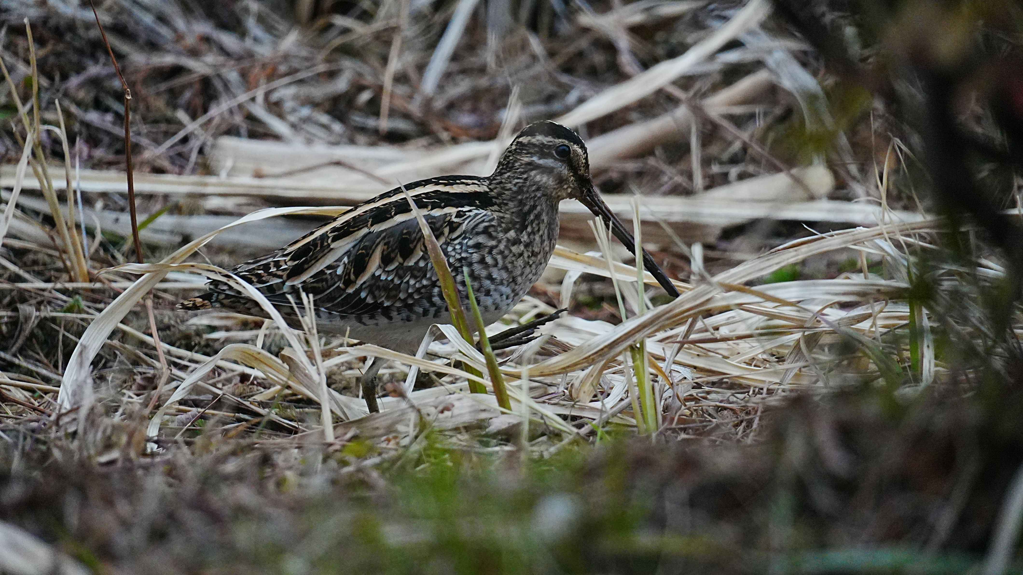 #田鴫#(#タシギ#)かなと思われます。 藪のあたりからカサカサ音がするので、覗いてみたらこの子がいました。 体と比較してながーいくちばしがキュートです。