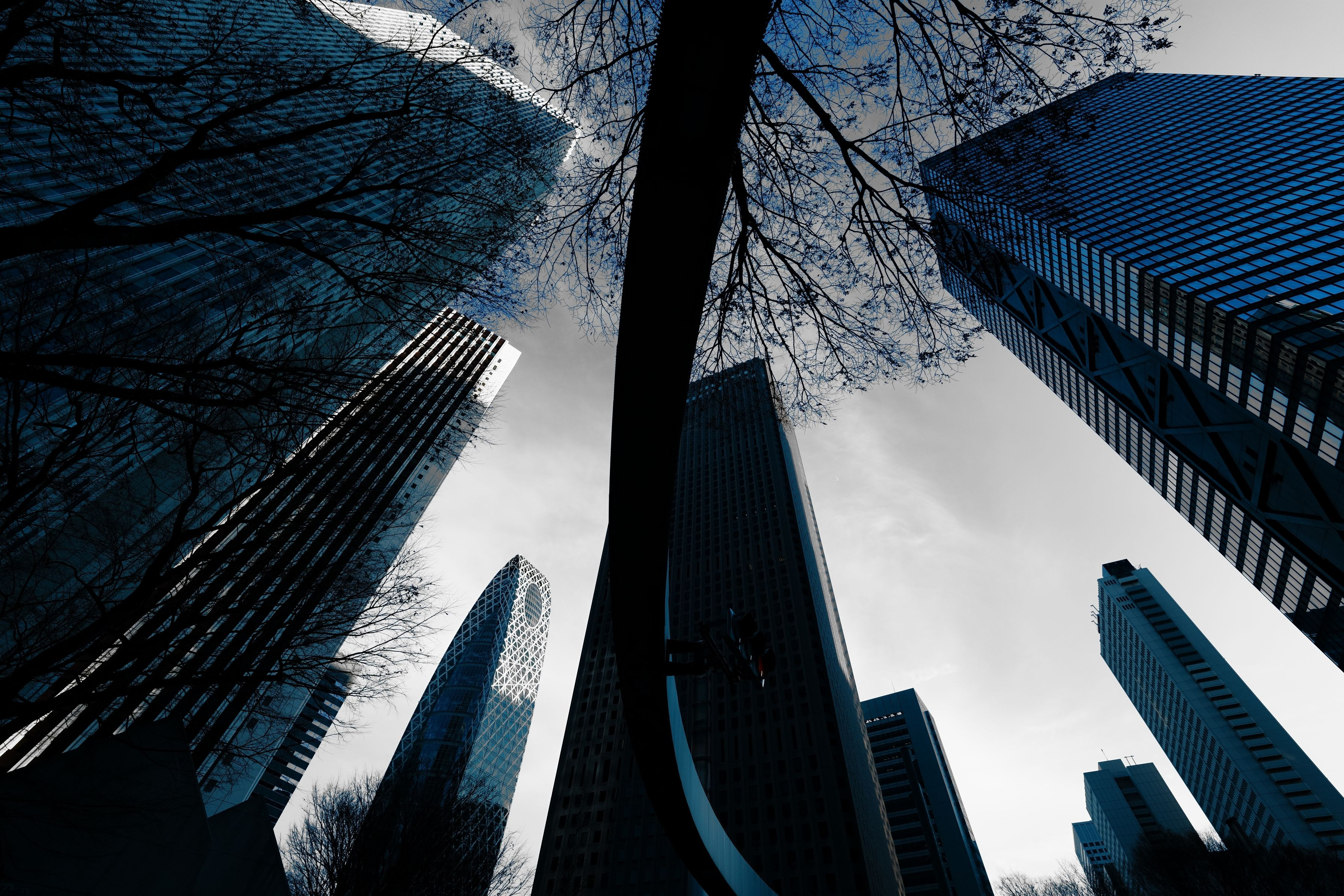 襲い掛かられているみたいなビル群。 真ん中のレールみたいなのは西新宿のとある交差点にある大きなリングの一部。