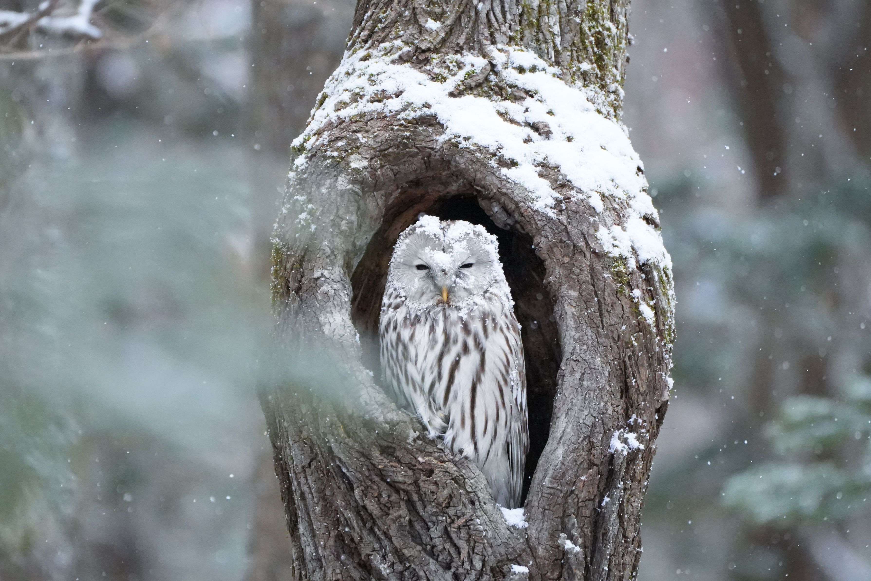 吹雪の中 山へ行ってみると 初めてのフクロウに遭遇 驚きました
