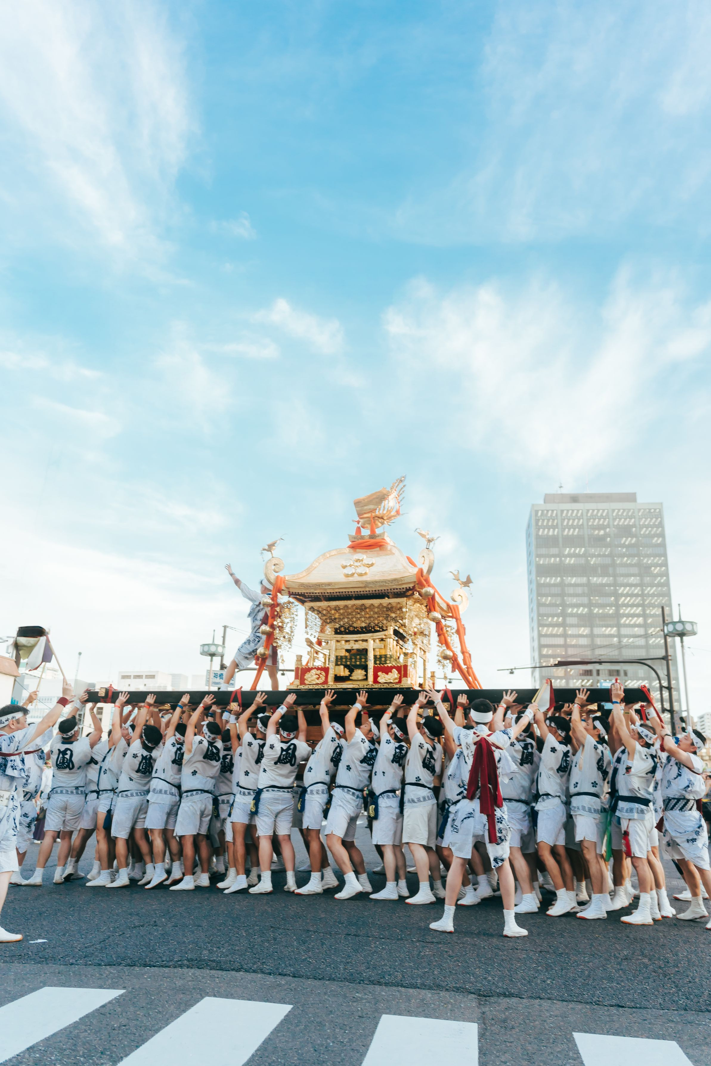 大阪府天神祭、陸渡御の鳳神輿です。 陸渡御の最後玉神輿を迎える橋前での差し上げ。2トンもの神輿を担ぎ続けた担ぎ手たちの最後の力を振り絞った最高の差し上げの瞬間です。 大阪の街中にも関わらず空が広く、まるで天まで届くかのようでした。