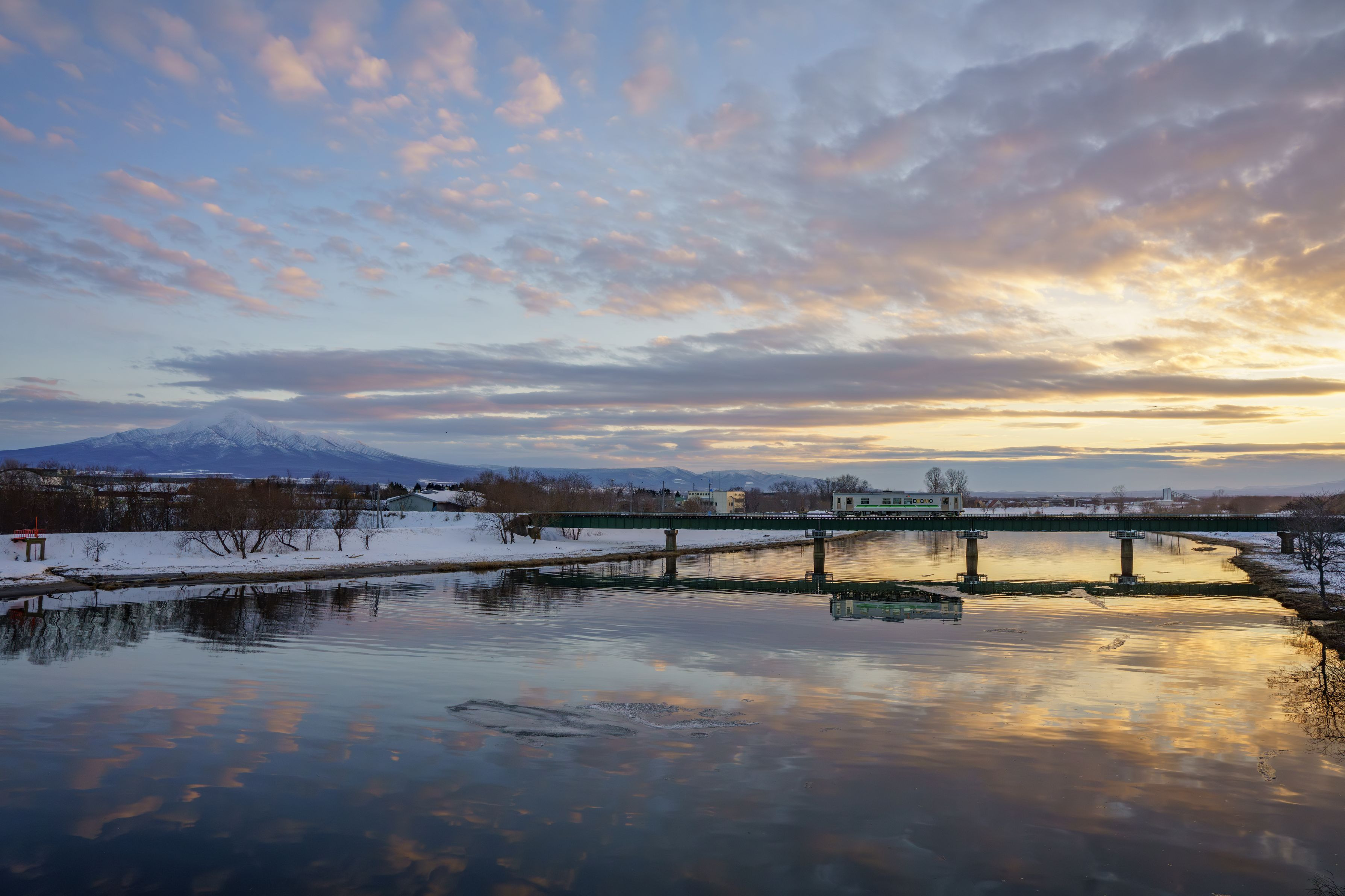 夕暮れ時の釧網本線、斜里岳をバックに捉えてみました。
