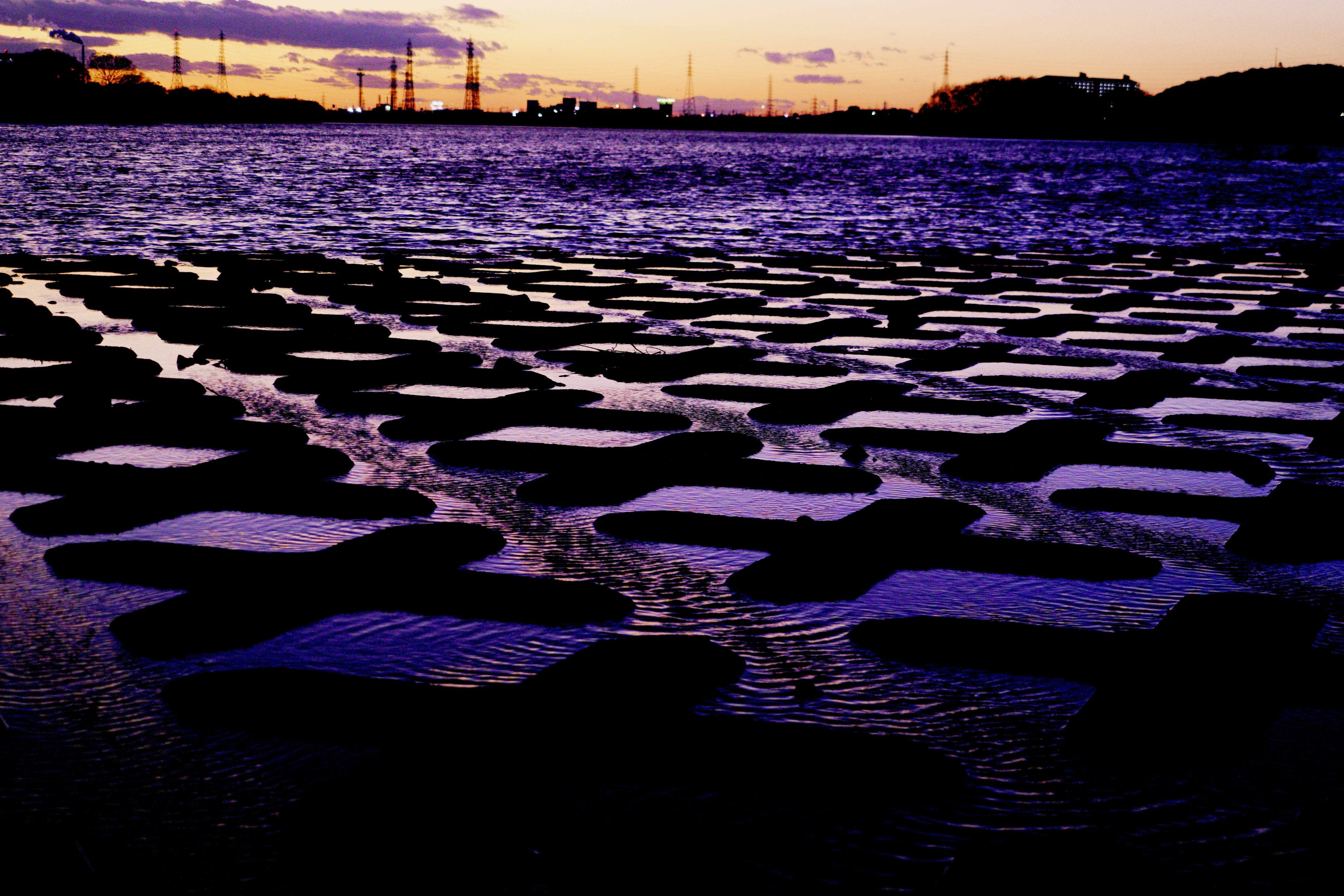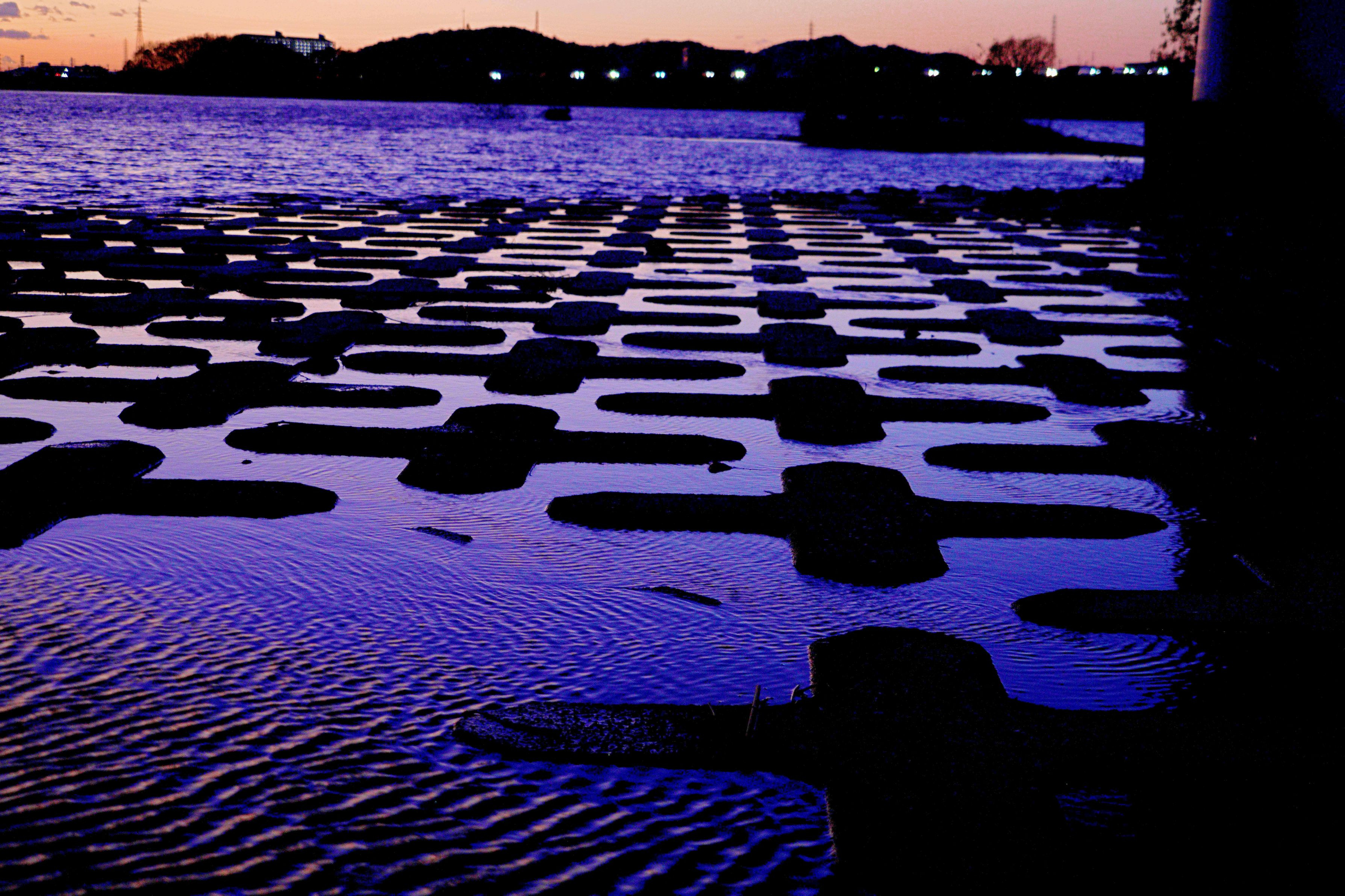 冬の季節は川の水位も低く意外な景色が水面に飛び出してくる。 普段見られない物が水面ぎりぎりに浮き出て面白い造形をかもし出した。 まるで古代文字?又は古代遺跡?の様です。