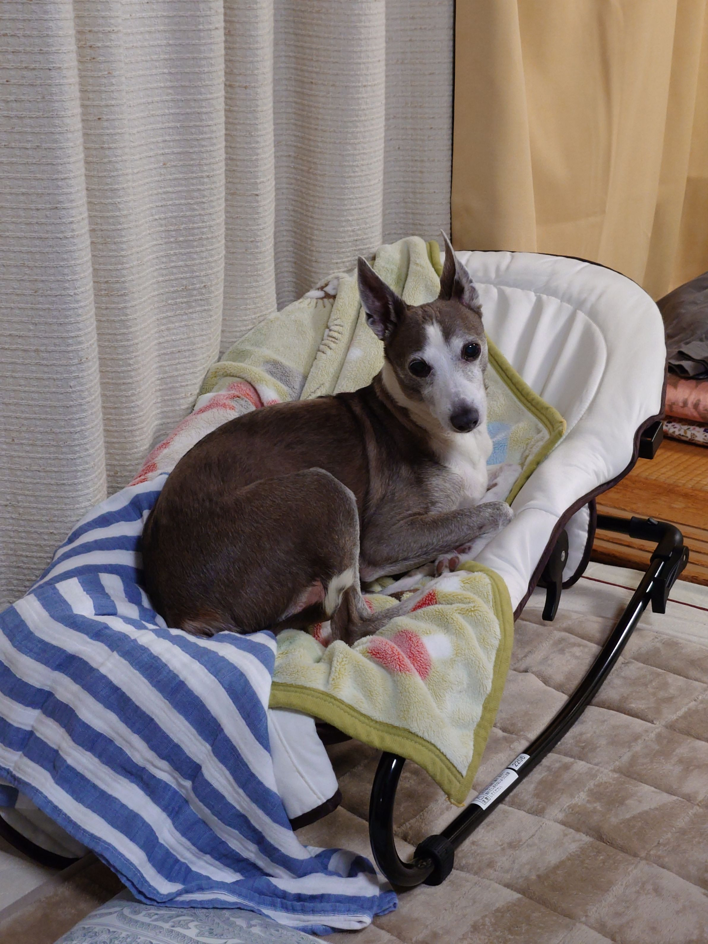 赤ちゃん(孫)を載せてゆらしていました。赤ちゃんがお風呂に行ったすきにちゃっかりバウンサーにのっかってました。いいでしょ!ポーズ。イタグレは香箱座りができます。猫ちゃんみたいに。