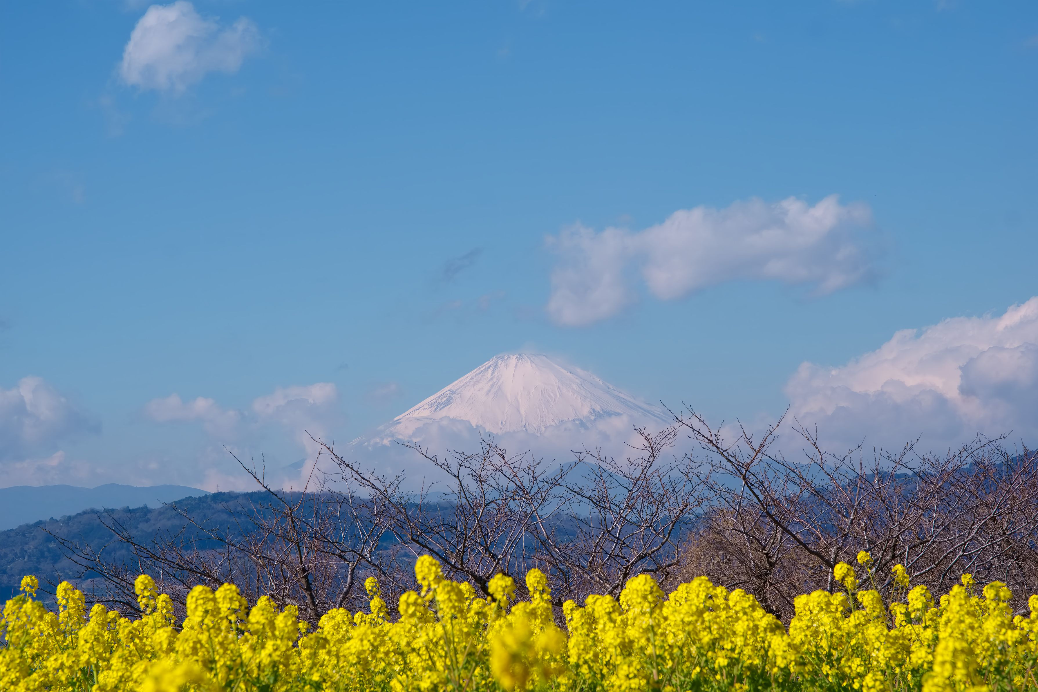 吾妻山公園の菜の花畑と富士山のコラボです。 黄色く輝く菜の花畑の背後には雪を冠した富士山が鎮座しています。