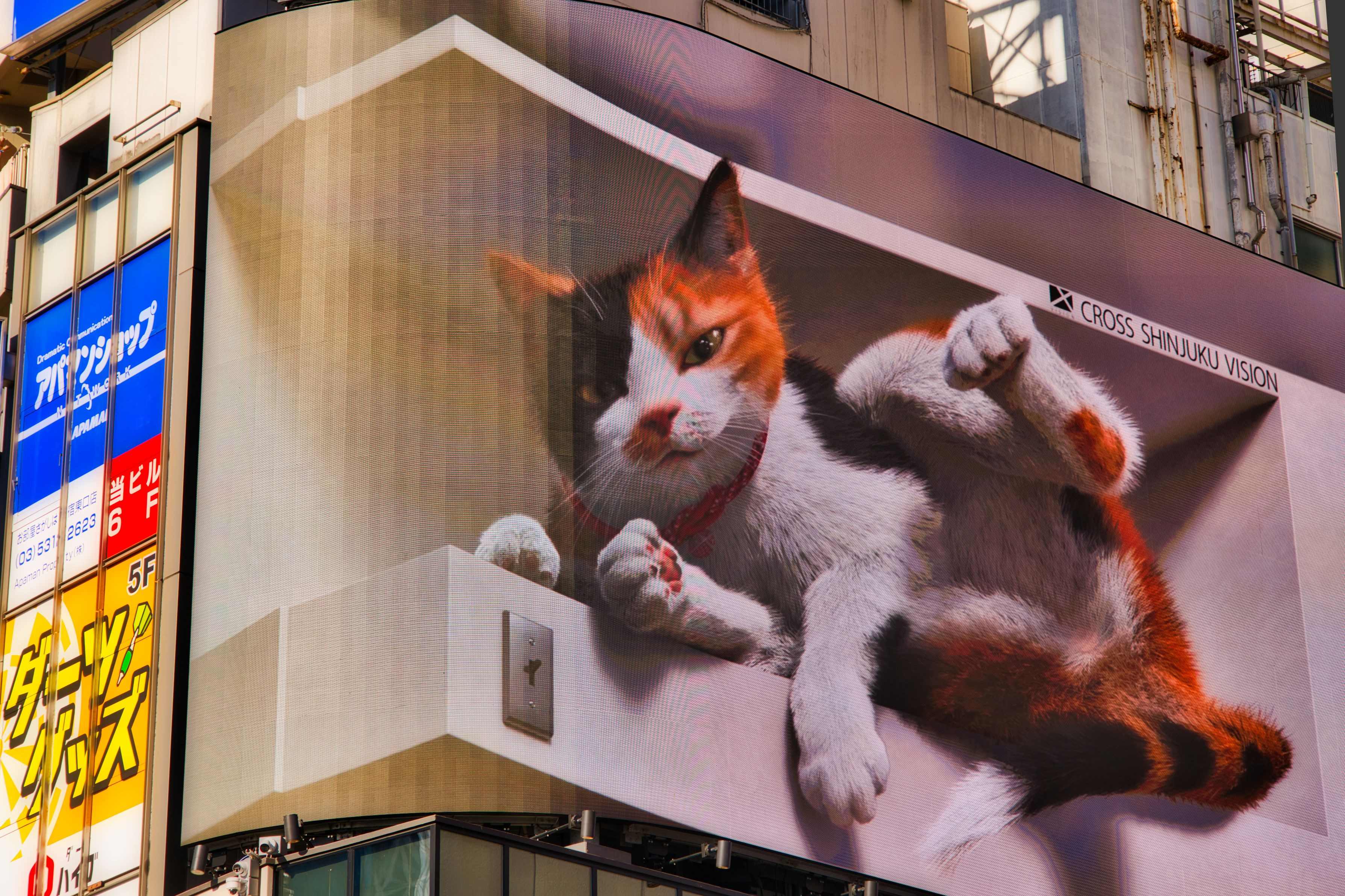 新宿駅東口、街頭ビジョン・曲面上の画面に映し出される 巨大な三毛猫のCG3次元映像「新宿東口の猫」 #東京都#