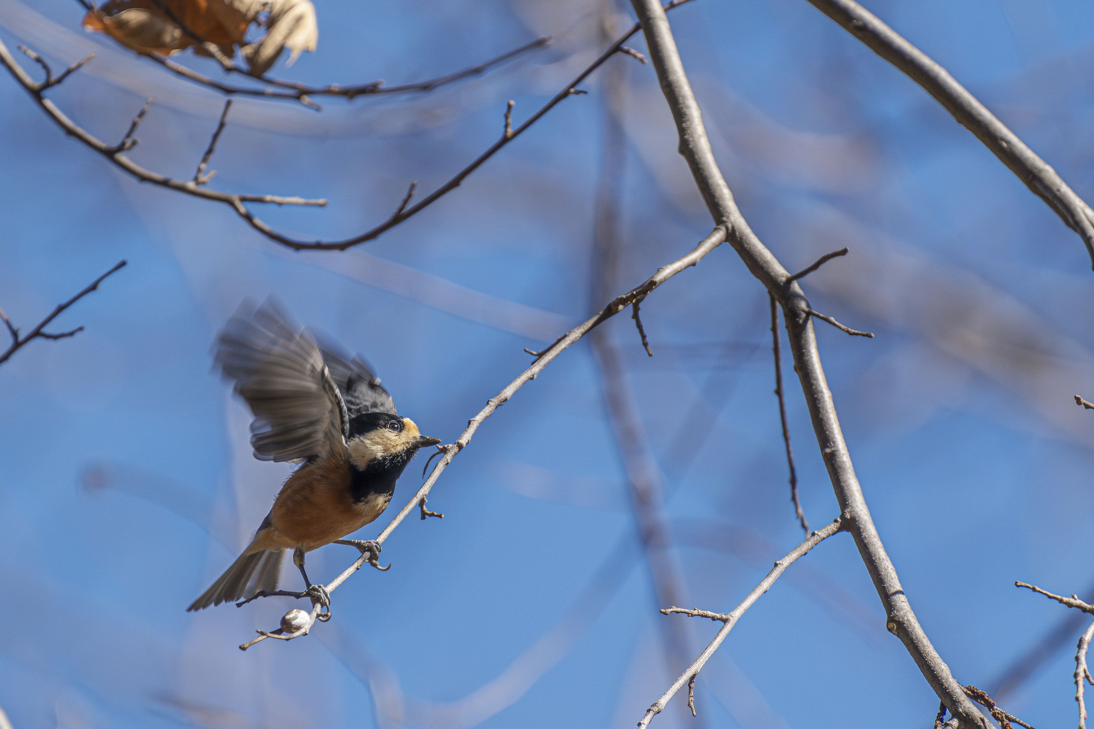 ヤマガラの飛ぶ瞬間を。なかなか落ち着きのないヤマガラさん。