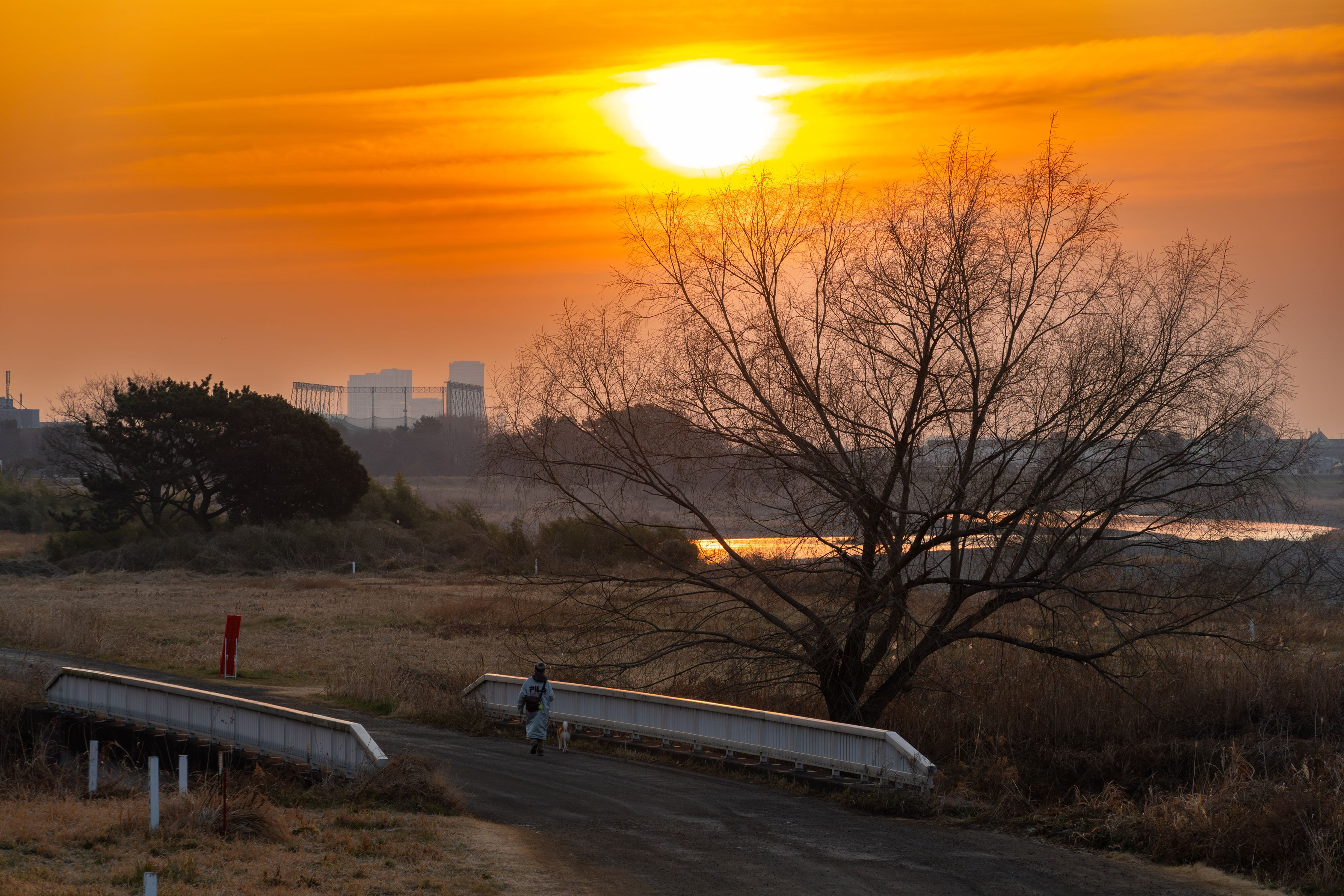 朝焼けと木のシルエットがいい感じだったので、犬のお散歩をしている女性を入れて撮ってみました(^^)