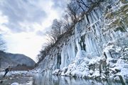 岩壁から湧き出る水が凍った氷柱 長野県 白川氷柱群