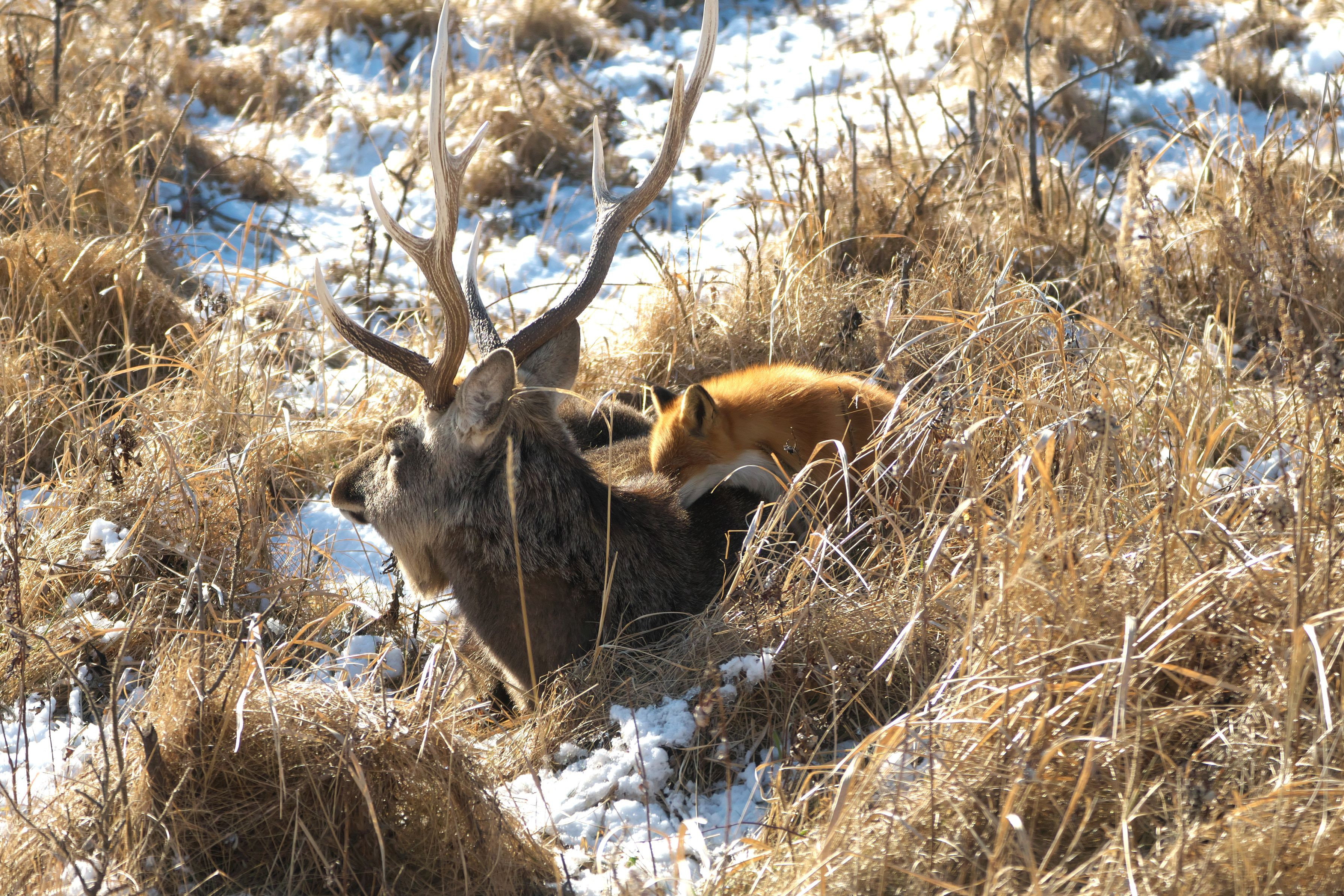 #生き物 一般# エゾシカの背中にキタキツネが乗りエゾシカの毛又は虫を取っている。