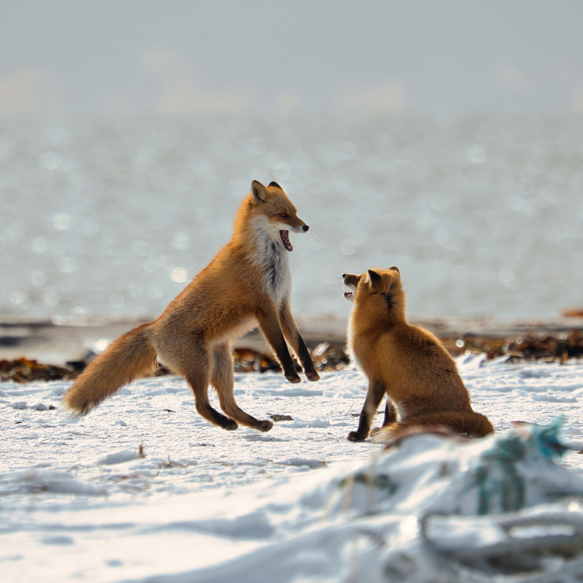 最果ての地と言われる野付半島の番屋付近で撮った1枚 兄弟だと思われるキタキツネが、時々こちらを気にしながらオオワシやオジロワシにちょっかいを出したり、じゃれあっていました。番屋を住処にしているんでしょうね。ごちゃごちゃの漁具が逆にキタキツネと人間の良きふれあいを感じさせました。