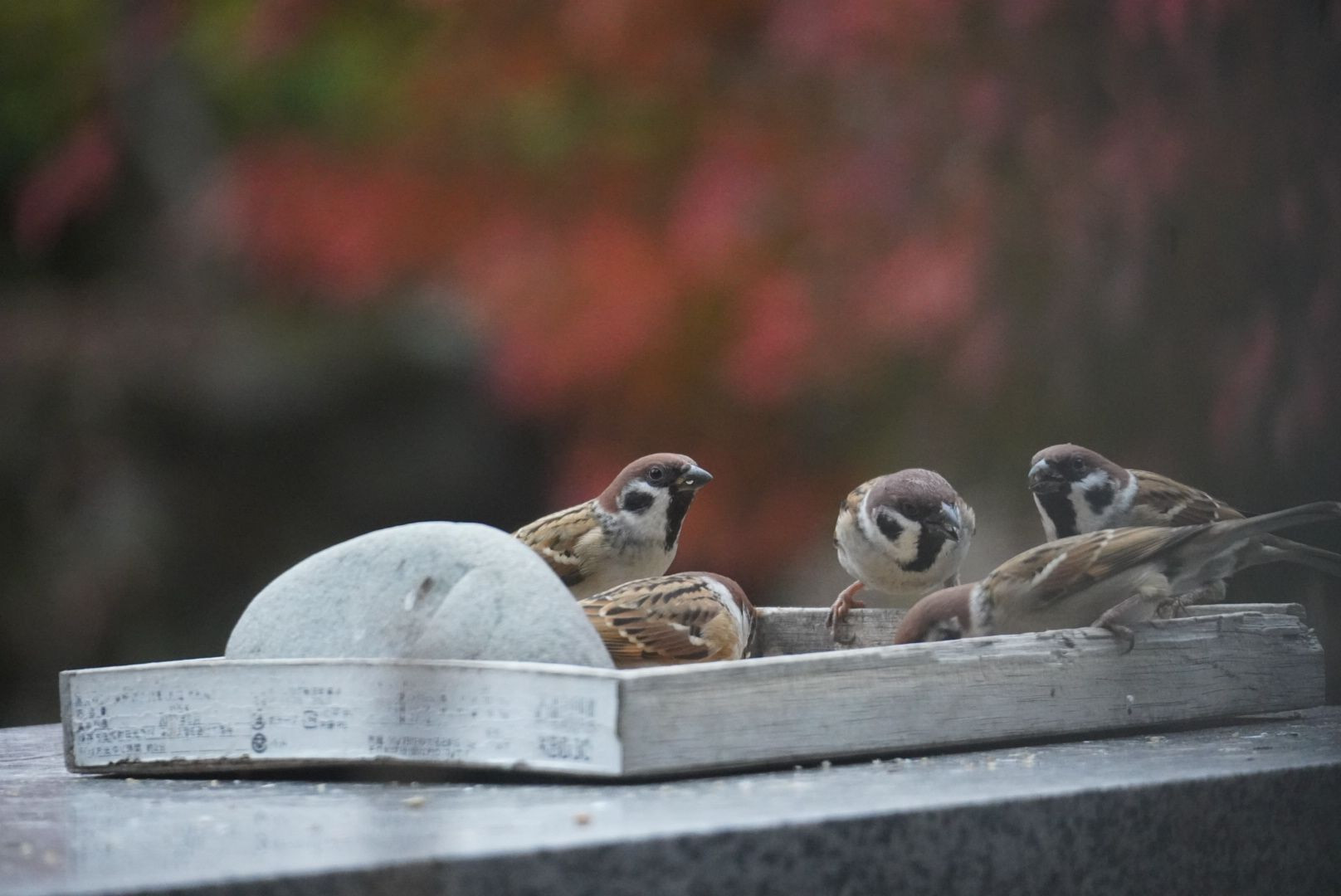 自宅庭に置いた餌場に集まったスズメたち。驚かさないように、家の中から撮影。