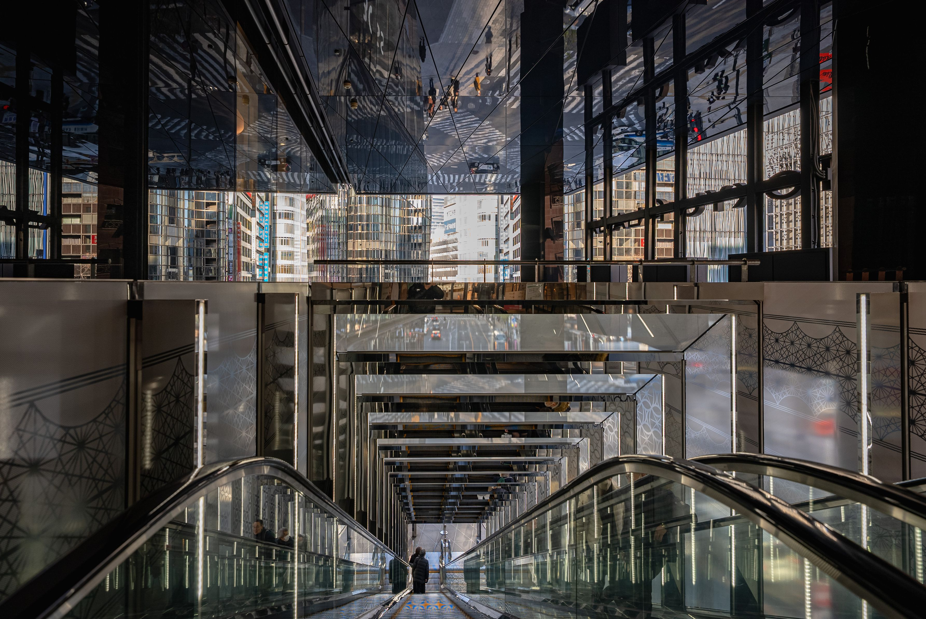 東急プラザ銀座店の出口に通ずる下りエスカレーターに乗る瞬間を撮影。この銀座店は、江戸切子をイメージにしたと言われ、彩光や光の反射をふんだんに取り入れた建物と思われる。 写真は、透明フロート板ガラスやバブ仕上げのステンレスの反射板のような素材を活かし、不思議な世界を造り上げている。また複数のゲートを用いて奥行き感を生み出し、まるで万華鏡の世界のようだ。