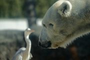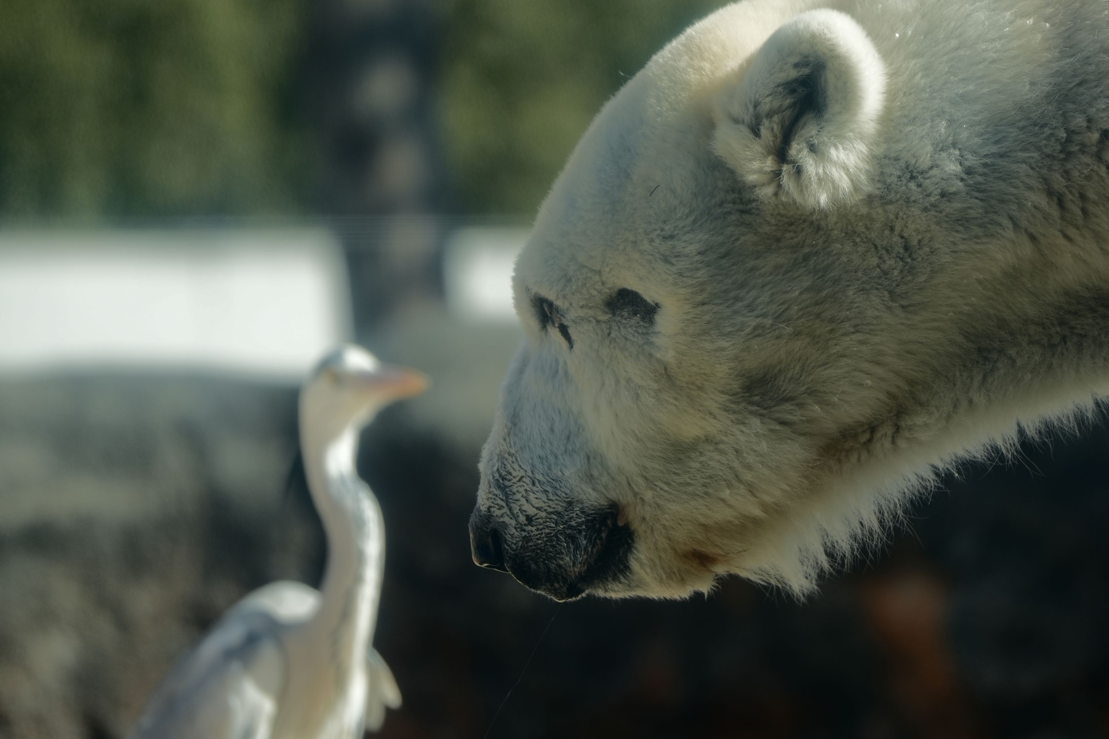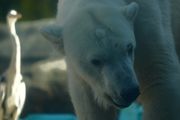ホッキョクグマの展示場でサギがいるのをよく見かけます。餌やりの時間に魚を横取りにするために来ているようです。この日は、ホッキョクグマが目の前に投げられた魚を食べる隙を狙い魚を横取りしていました。