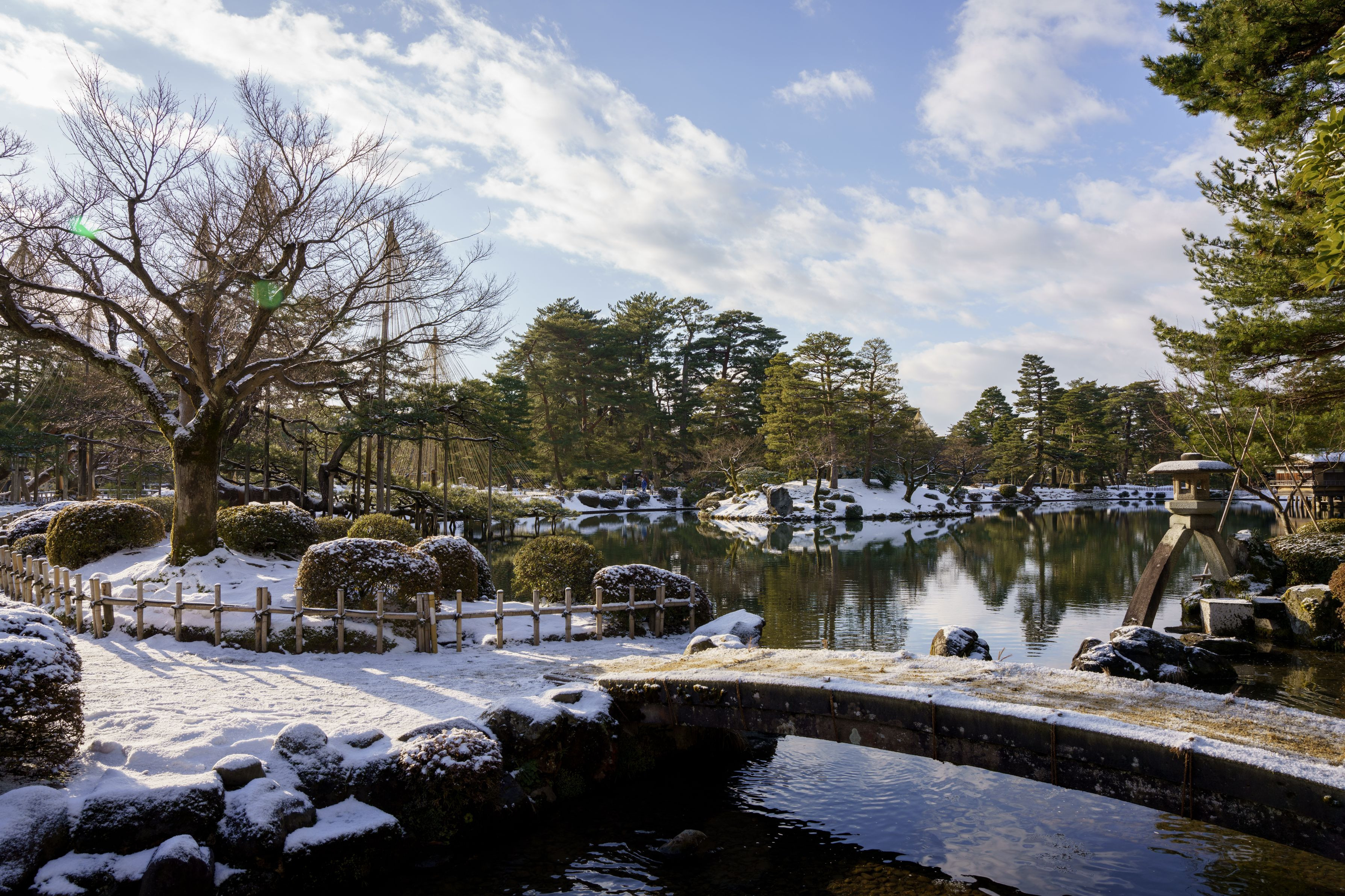 ほんのり雪化粧をした兼六園。 10分だけ青空と太陽が射した瞬間を捉えました。