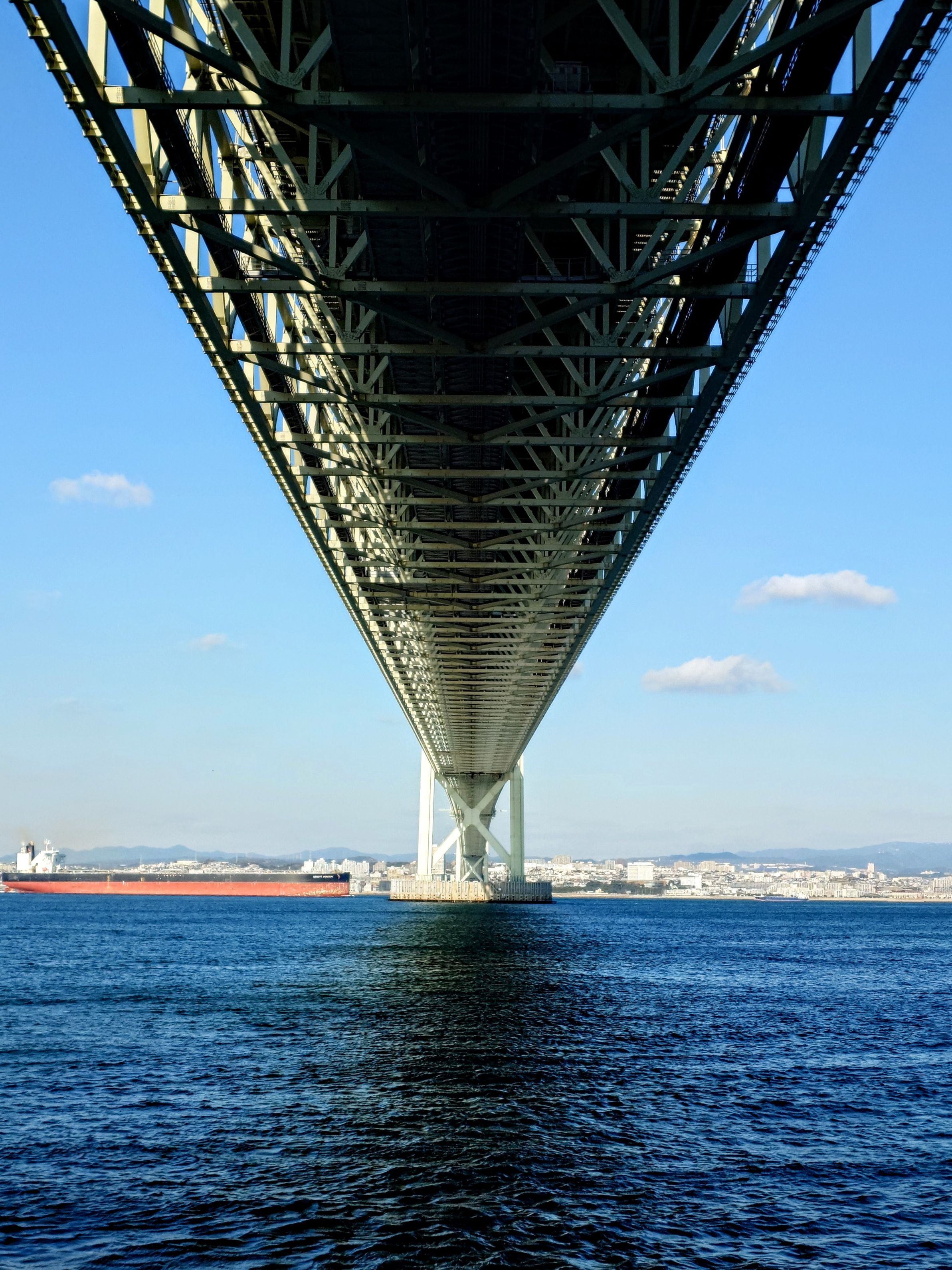 世界最大の吊橋明石海峡大橋の下を航行する巨大タンカー
