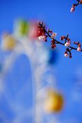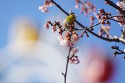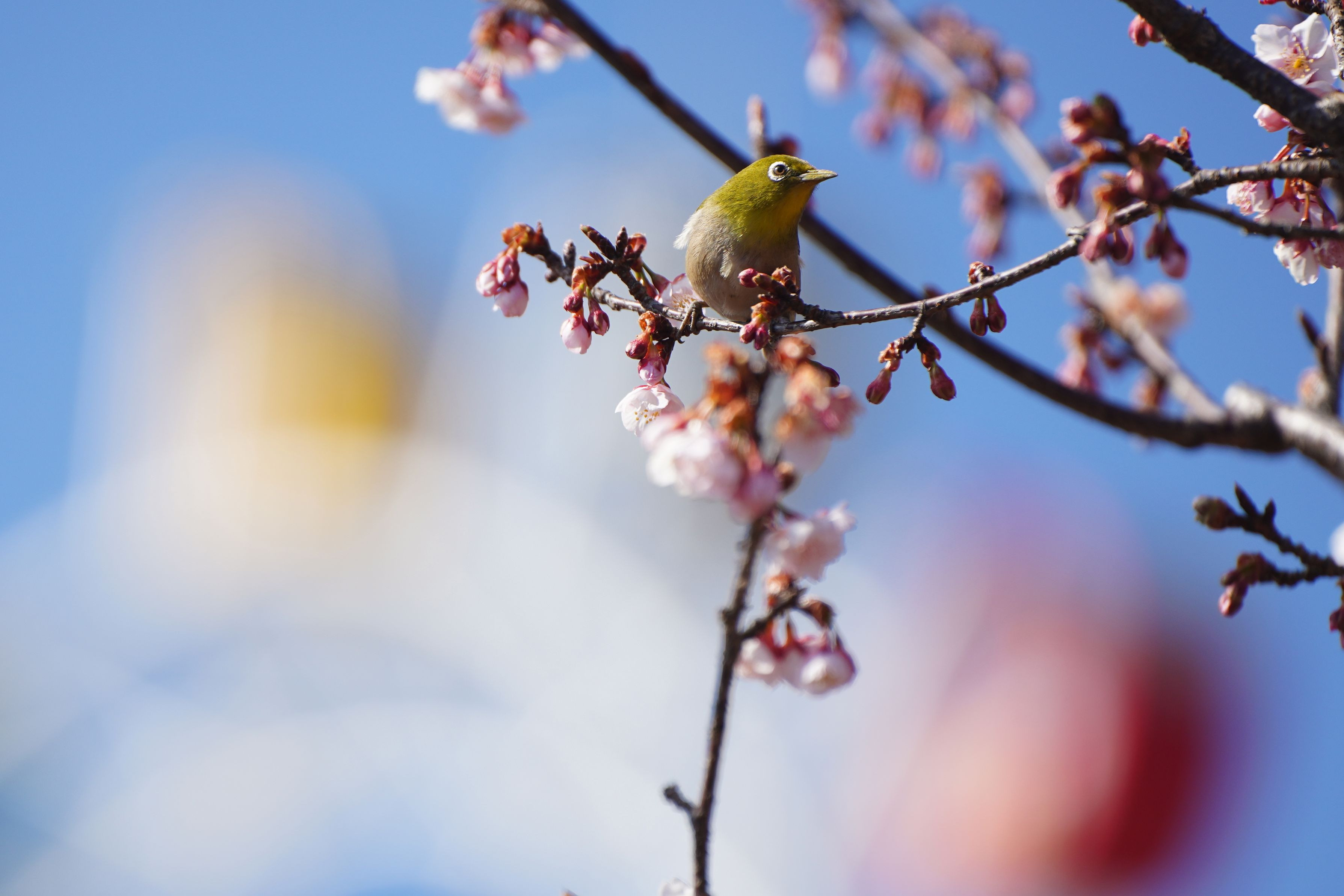 日立紅寒桜が五分咲きになり観覧車をバックにウキウキするような春をイメージして撮影しているとメジロが花蜜を吸いに来てくれました。桜と観覧車の間に電線が通っているのですが絞りを調整しながらぼかして撮影しました。