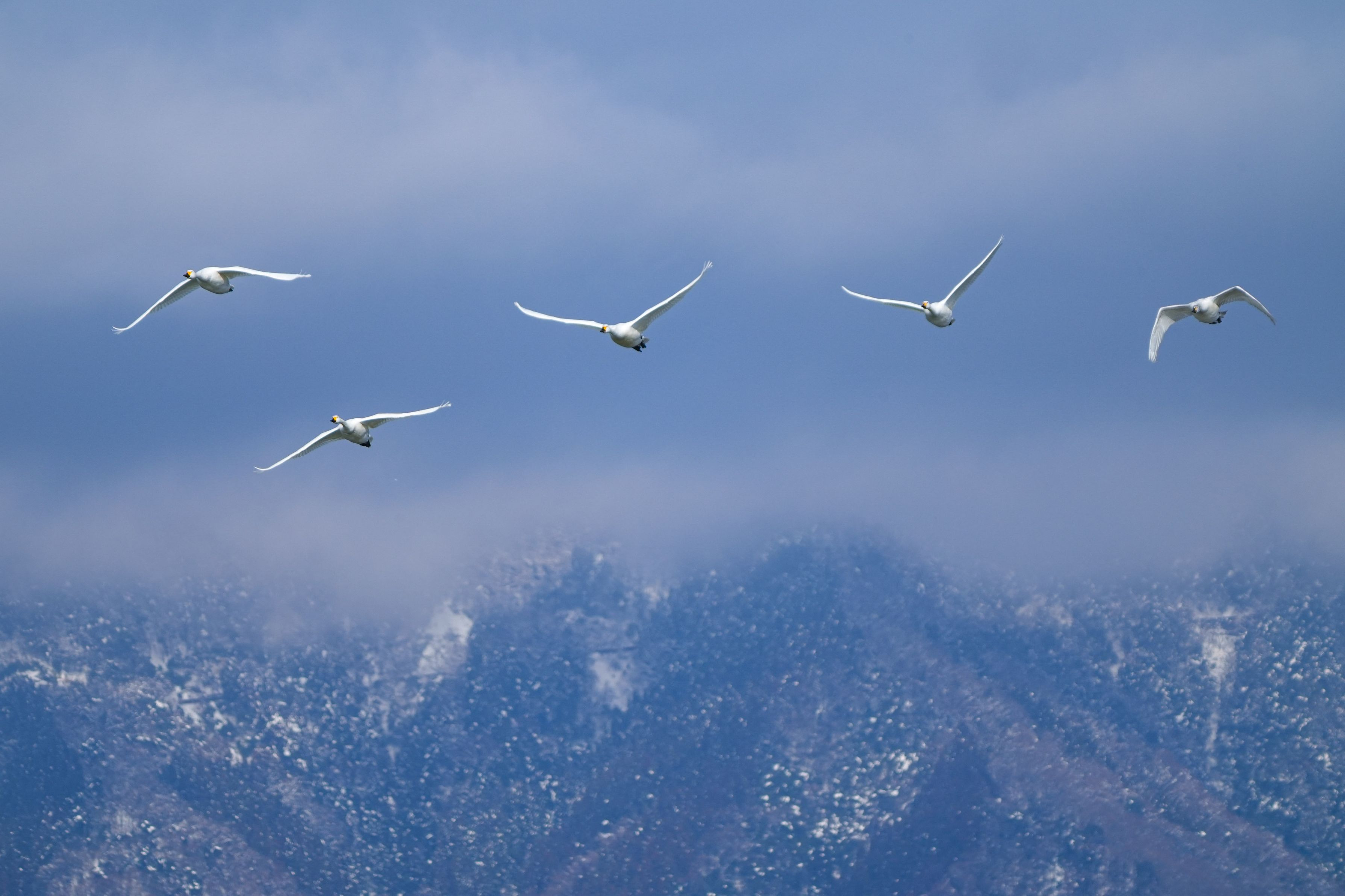 雪山を背景に飛翔するコハクチョウです