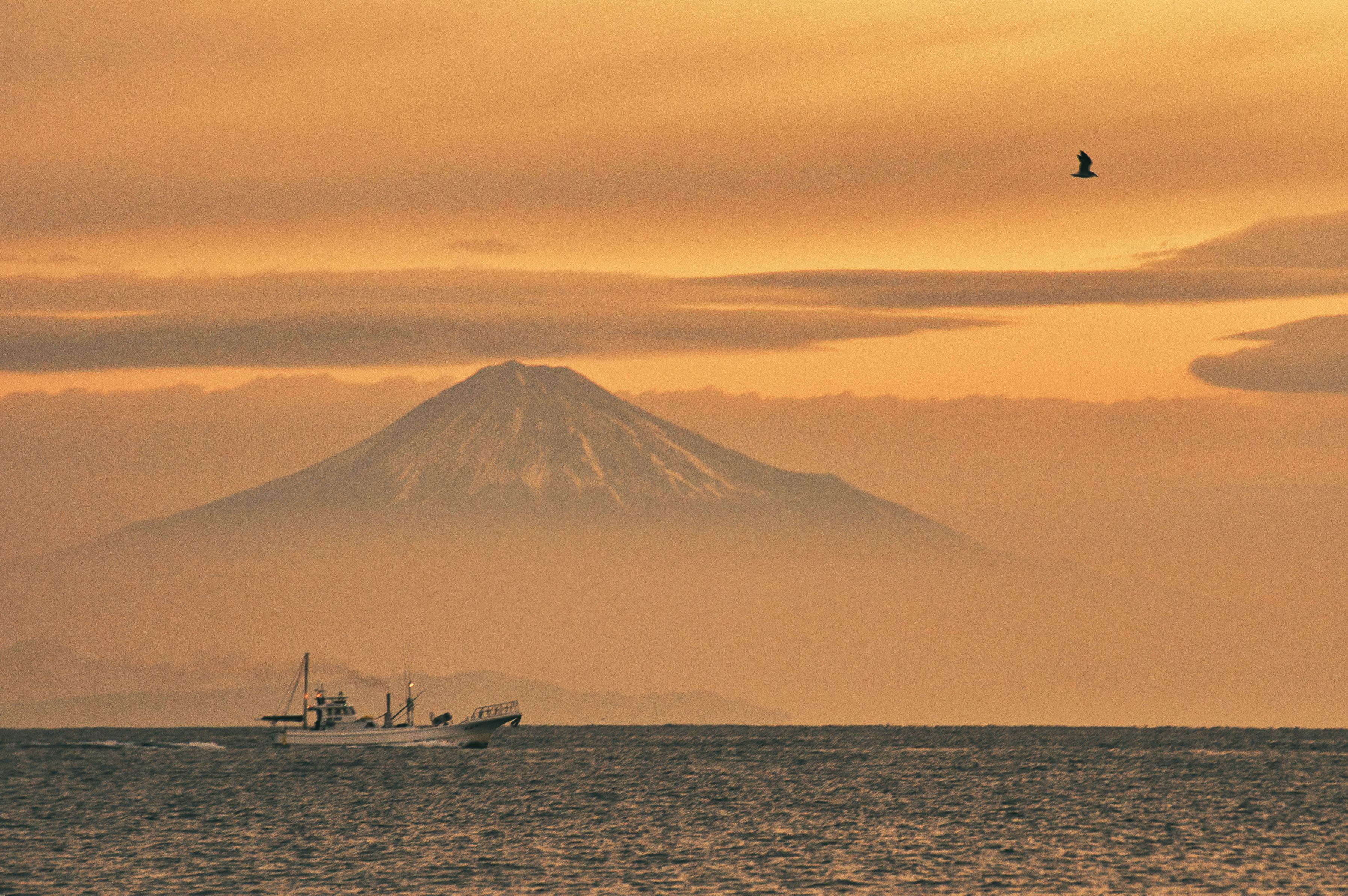 富士山が綺麗にオレンジに染まっている時間。 漁船と海鳥を合わせて撮ってみました。 久しぶりの早朝海岸でしたが 寒さはなし(^^♪ さすが静岡です♪