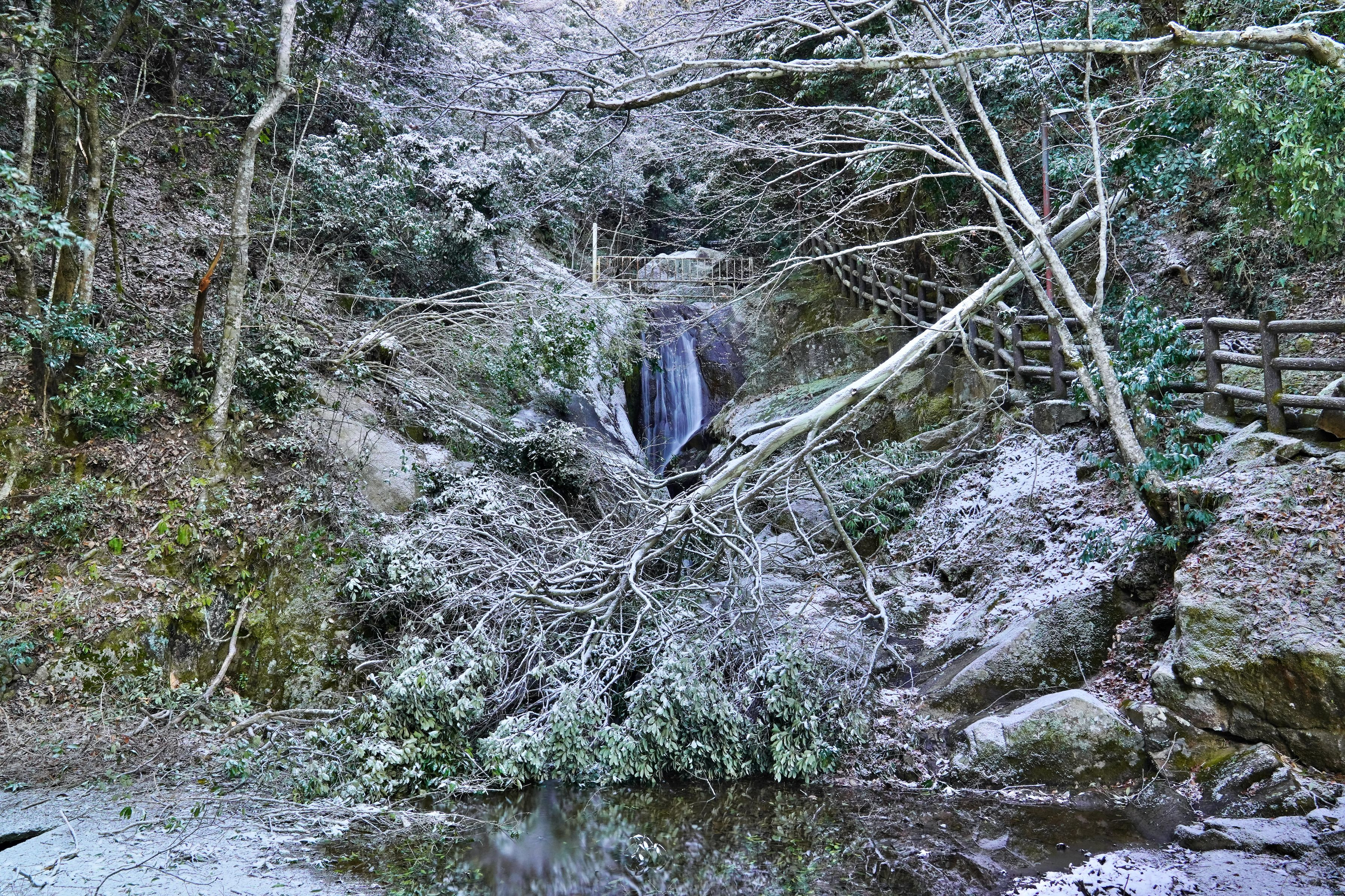 当地の小さな観光地の滝ですが、数日前の雪で木が倒れてしまいました。これぐらいでは他の災害地に比べるべくもありませんね。しかしながら、倒木を取り除くのは人力に頼るしか無いのでそれなりの時間を要します。人間の力って弱いですね。