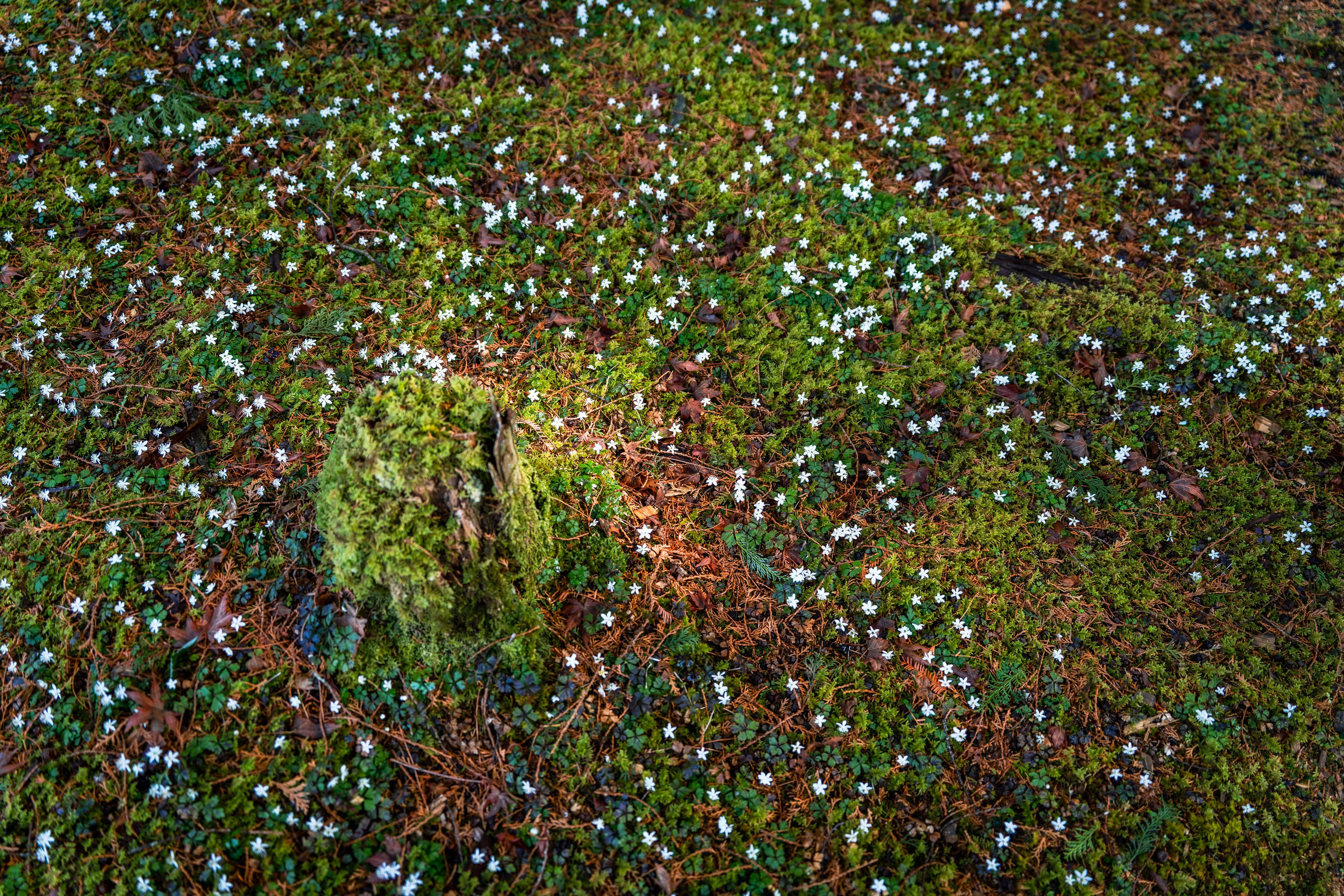 久しぶりに訪れた牧野公園は、可愛いバイカオウレンの花が咲き乱れ、あたかも切り株のまわりで踊っているかのようでした。