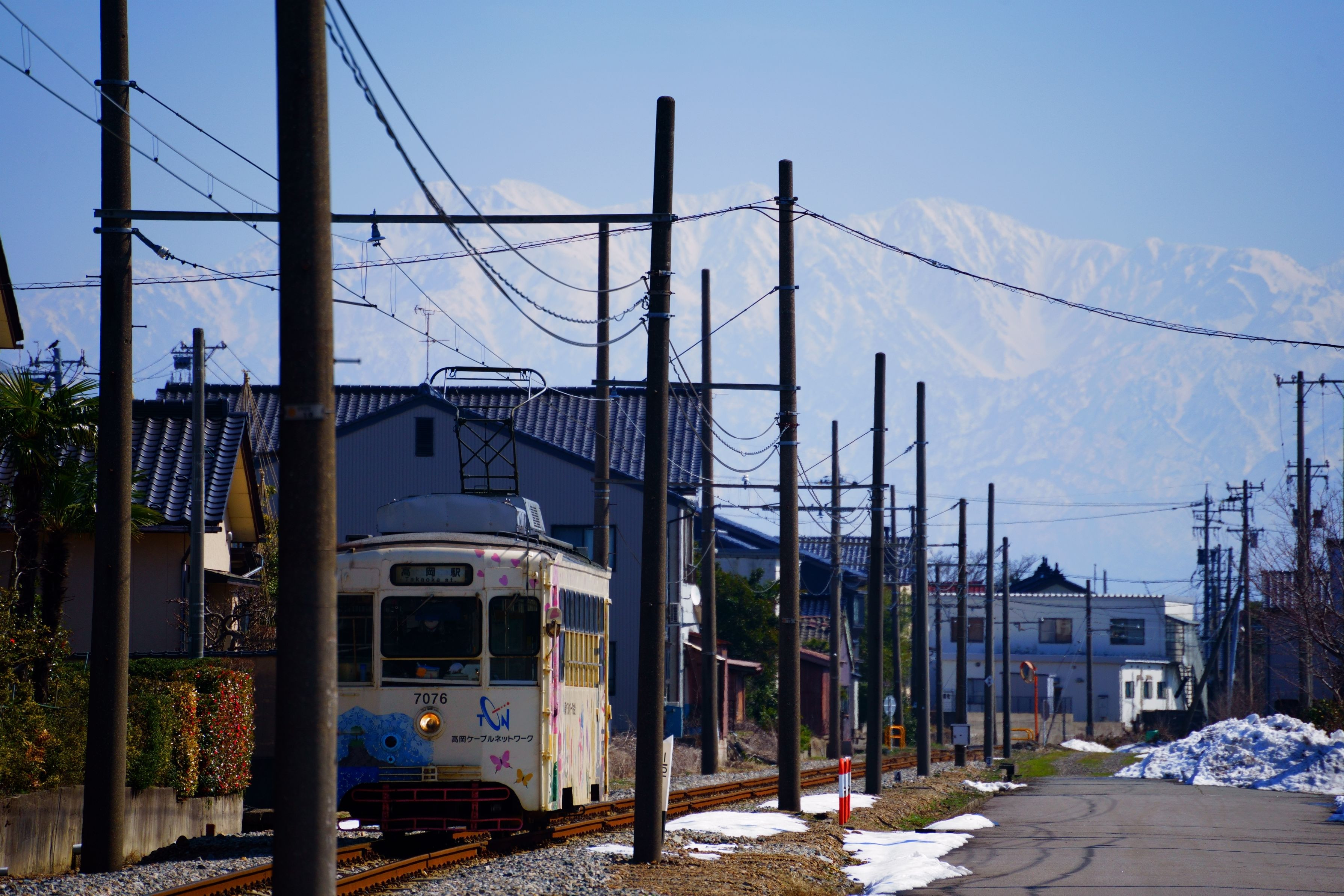 何とか収まってくれた 万葉線 デ7076号 と立山連峰(多分)