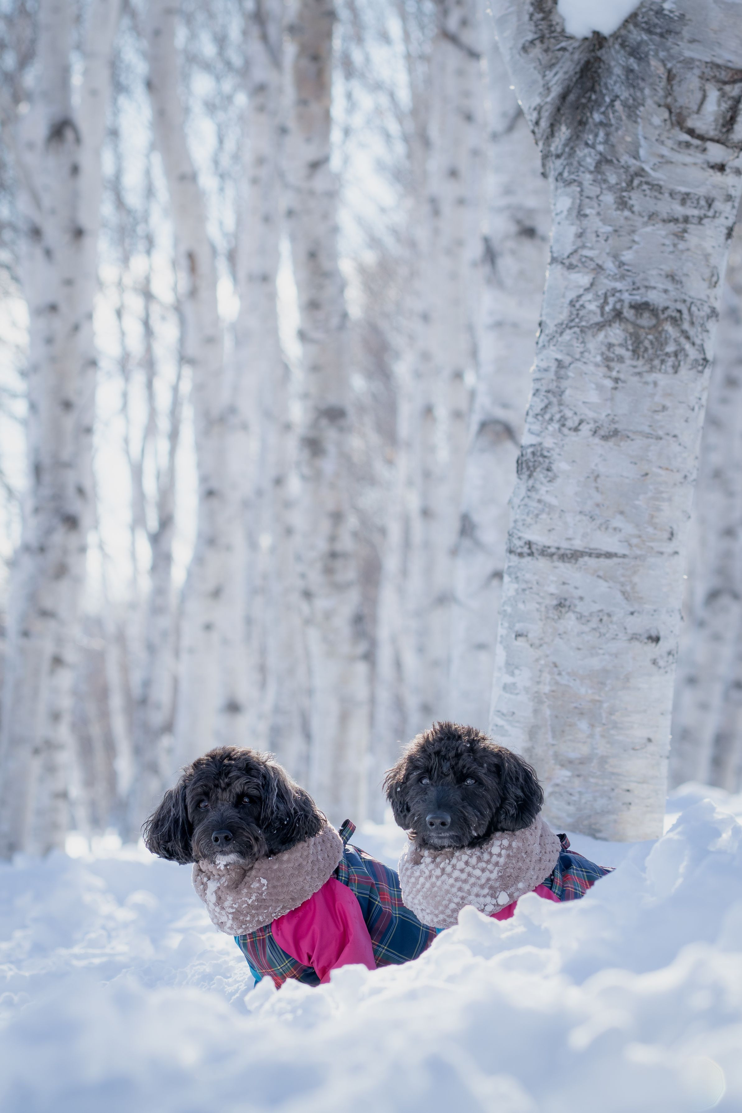 北海道では多く見かける白樺の木。 雪が降るとさらに綺麗な景色に! 白銀の世界で黒い2人に引き込まれそうになる感覚になりました✨