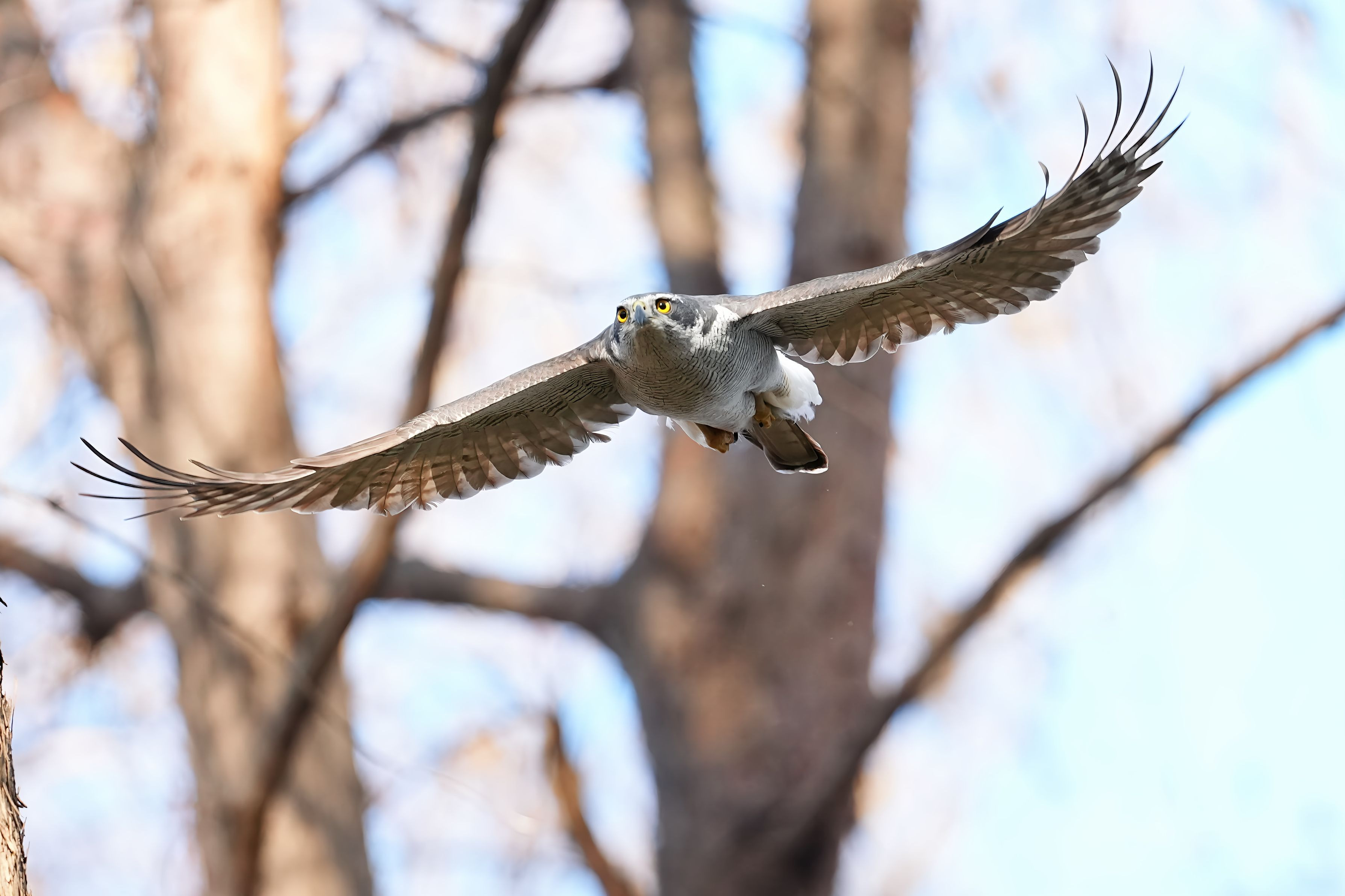 背中を向けて止まっていたオオタカが振り返ってこちらに飛んできました。今日はラッキーでした。