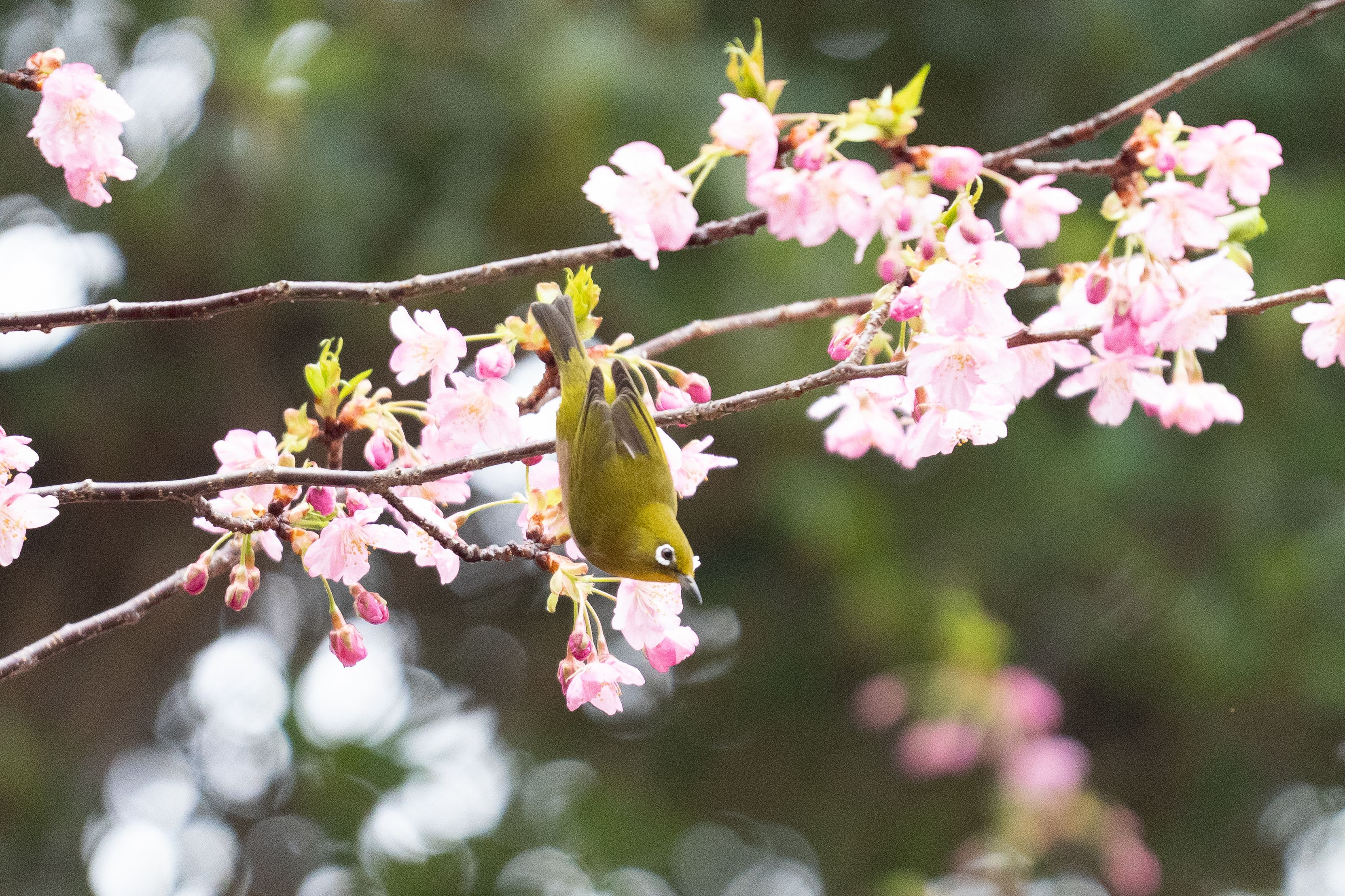 桜の枝で動き回るメジロ。