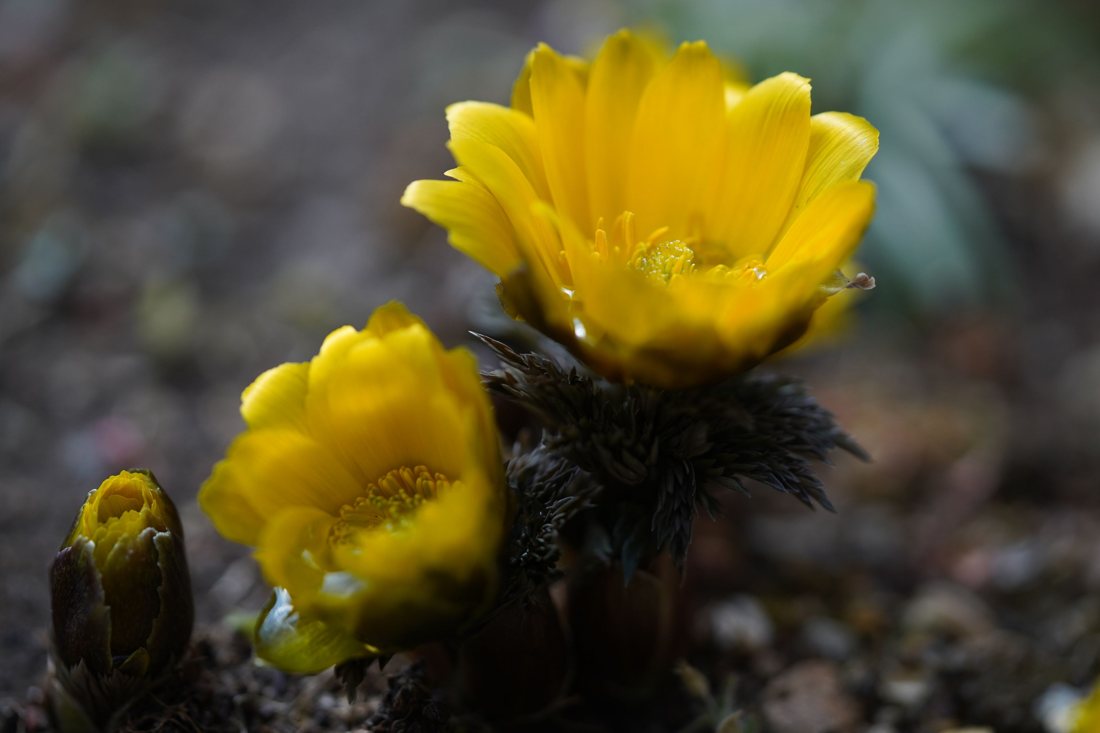 例年より遅い開花の福寿草