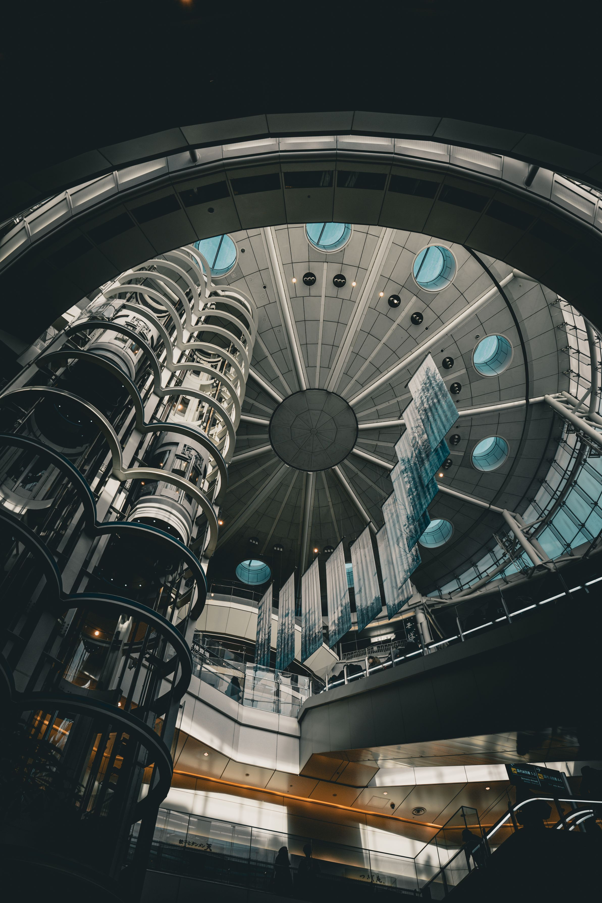 羽田空港第二ターミナルの天井を撮影しました。SF映画に出てきそうな迫力ある天井。 まるでスペースステイションに帰還したUFOのようにも見えますよね!