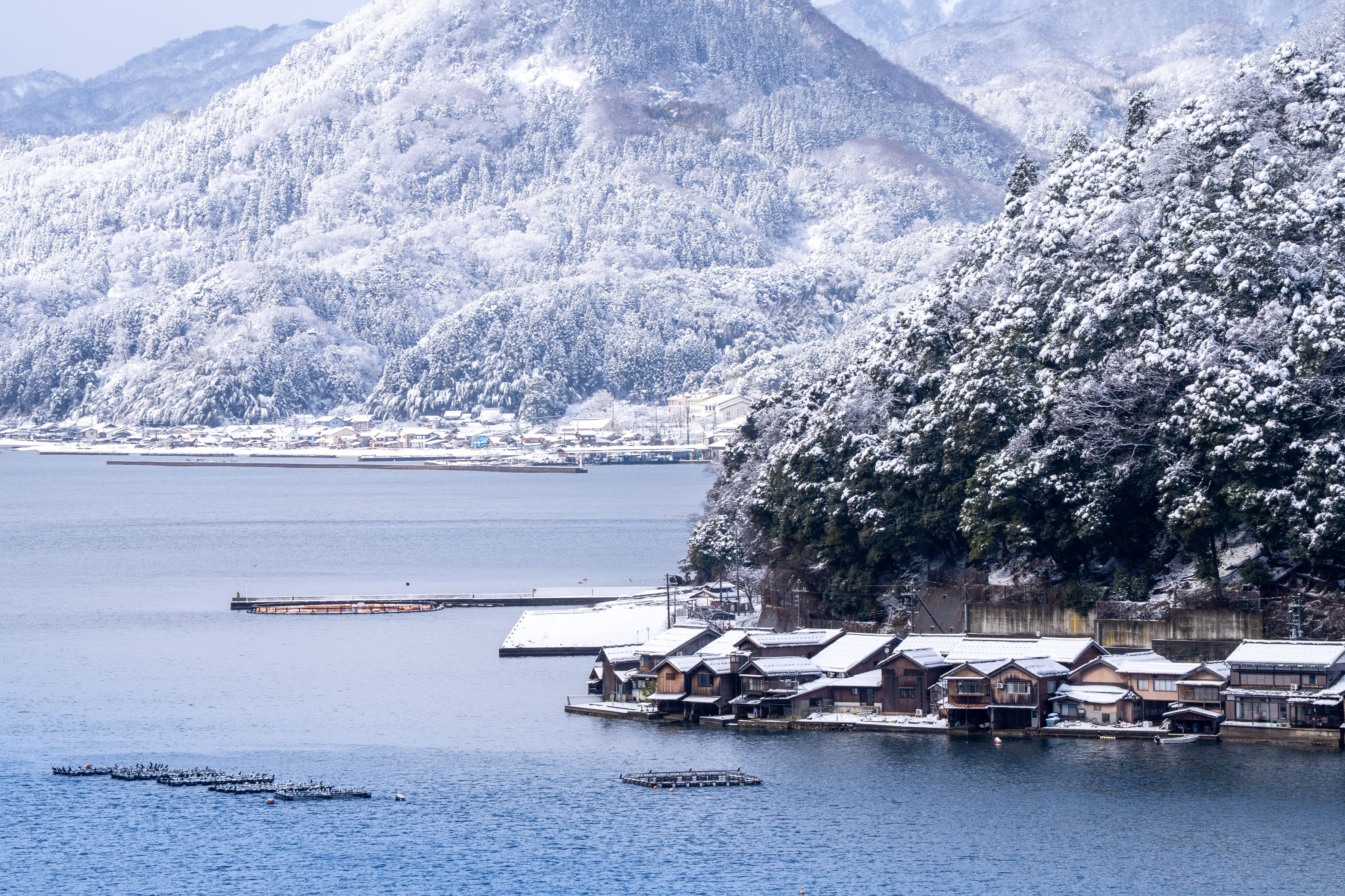 雪化粧した 伊根の舟屋