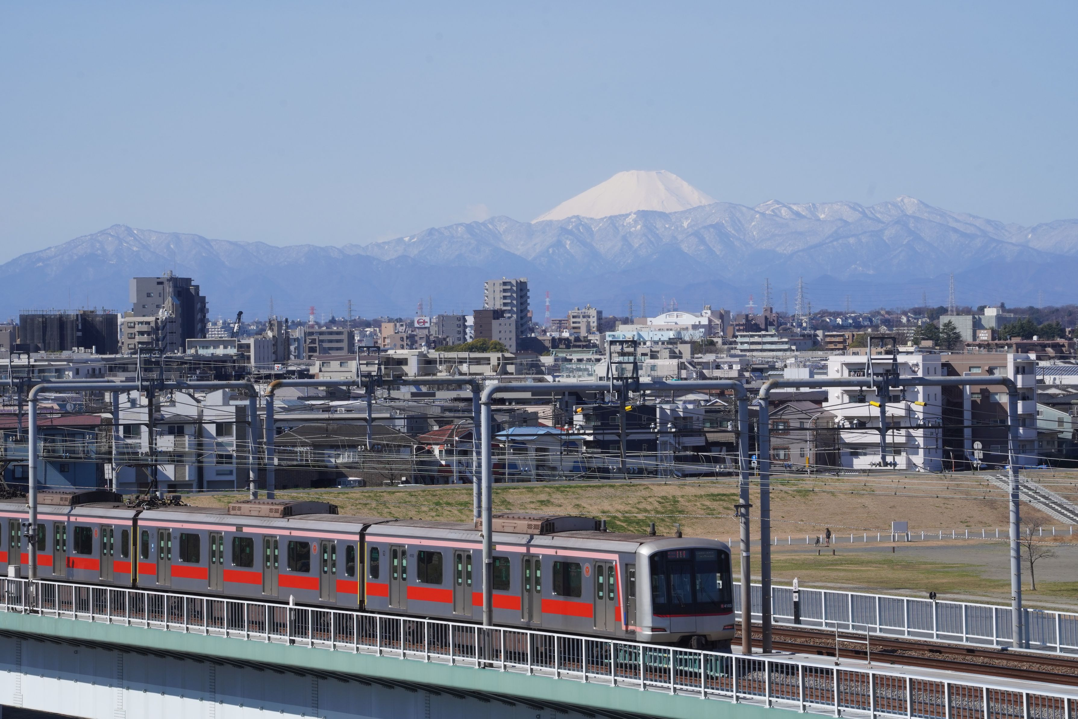 やっと積もった山々をバックに快走する東横線です。 春が近づいてきた兆しを感じつつ。