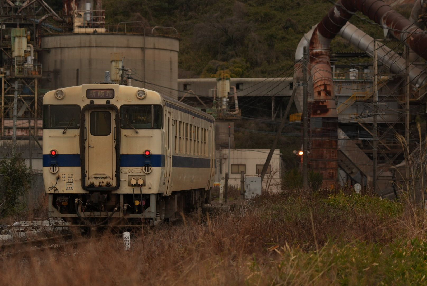 20250303。石灰石鉱山や麻生セメントの工場に囲まれ、筑豊の歴史や特徴を詰め込んだような、JR後藤寺線・船尾駅。田川後藤寺から新飯塚に向かう車両。1両編成の後ろ姿が、どことなく夕暮れ時の寂しさを感じさせる。