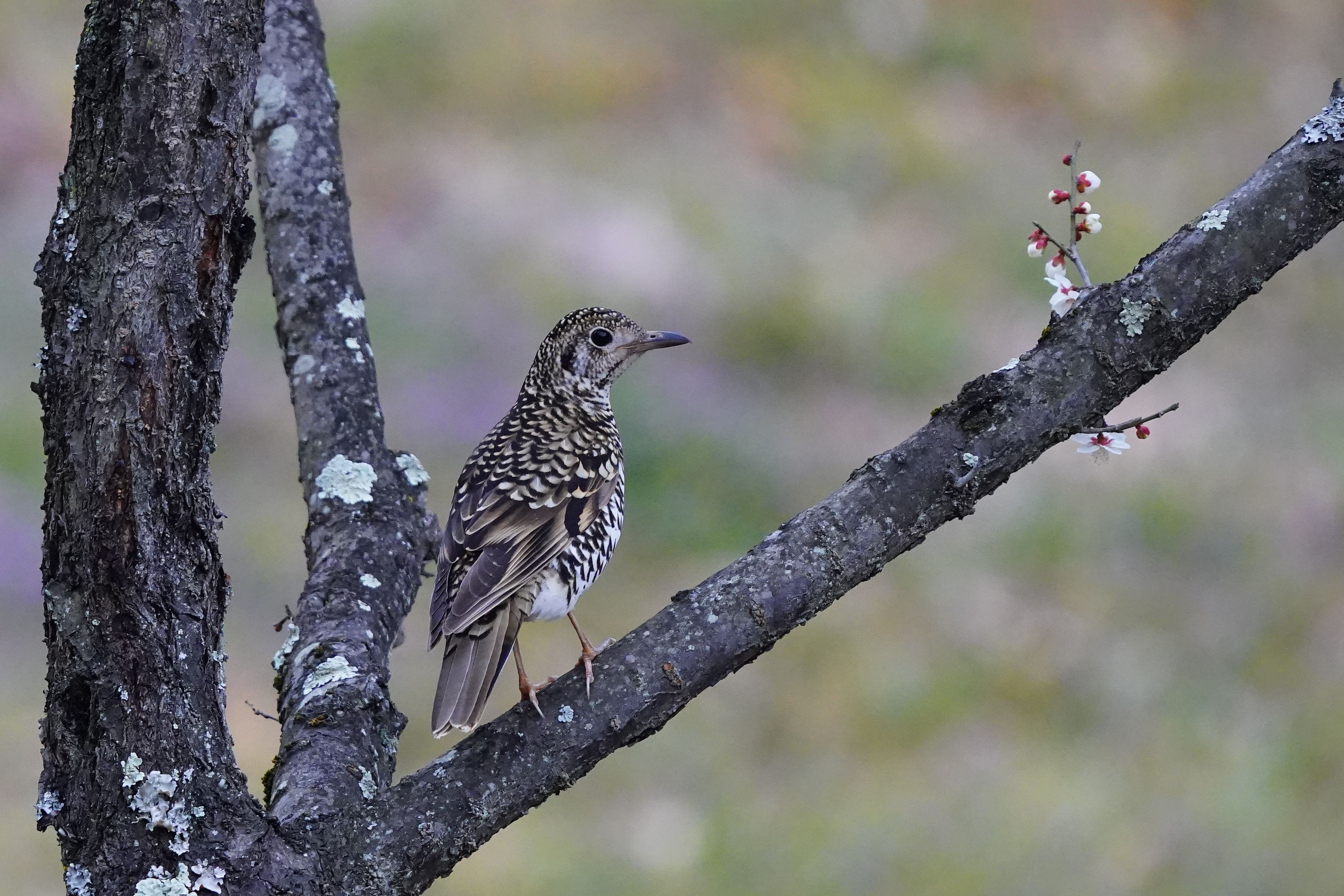 公園内の梅林、地面で落ち葉をひっくり返していたトラツグミ 散歩に来た人に気が付いて枝に止まりました。
