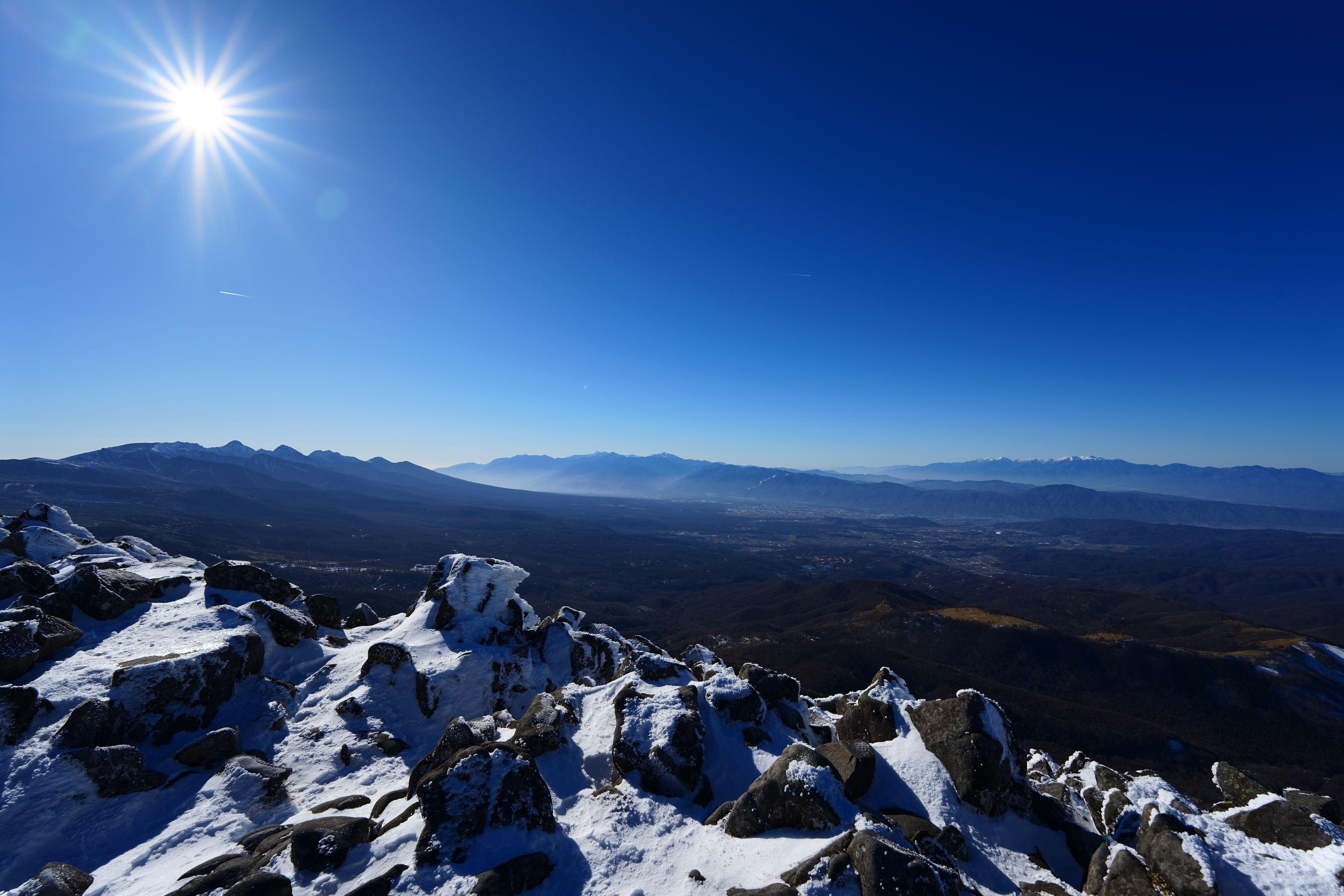 冬の蓼科山山頂からの一枚。八ヶ岳ブルーの下、八ヶ岳、南アルプス、中央アルプスの重なり合いが光と影でうまく撮影できました。
