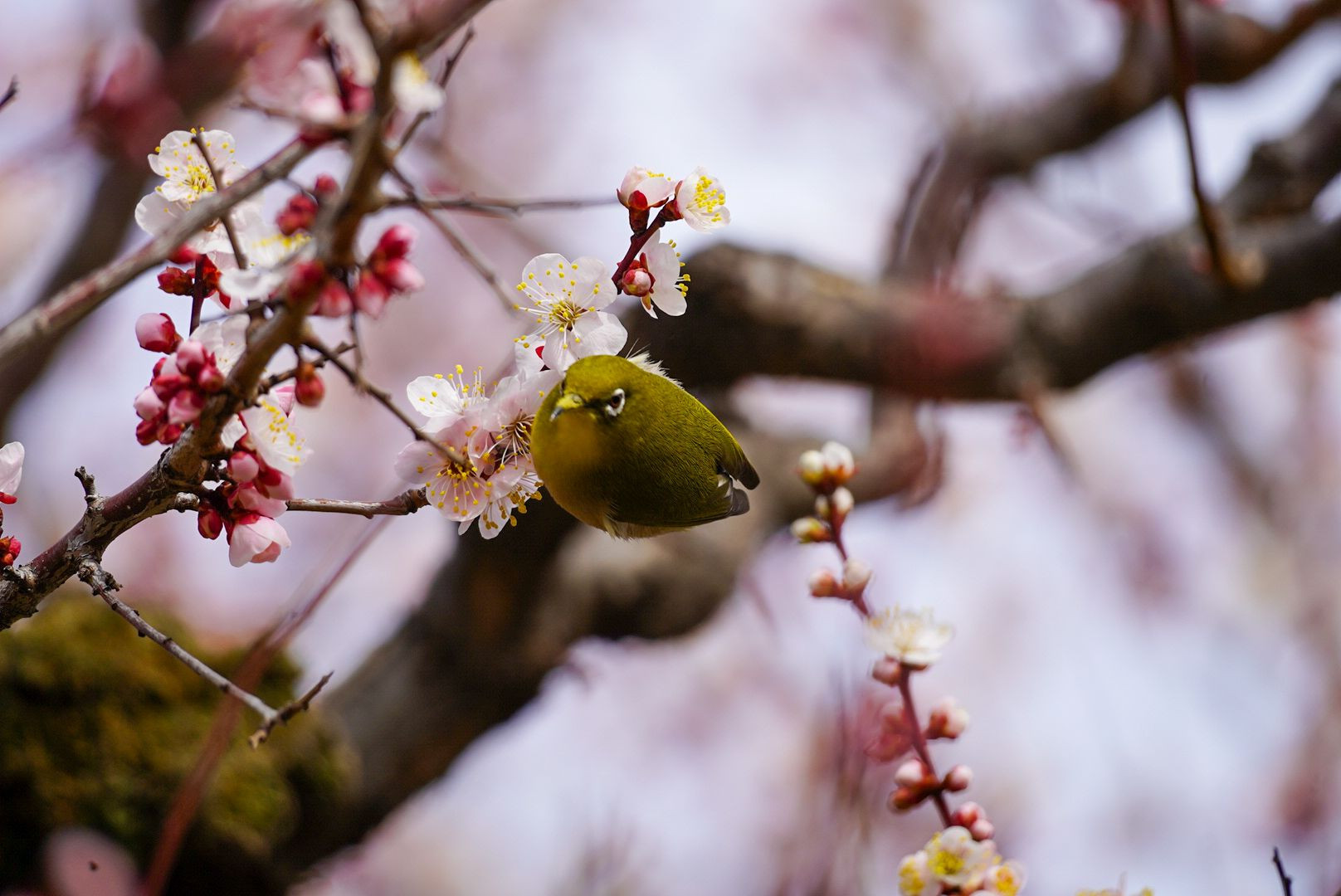 大阪城公園梅林で撮りました📸 急にメジロの大群が押し寄せてきてびっくり!!なかなかピントが定まらず大変でしたがまるっとしたメジロさんが撮れました✨