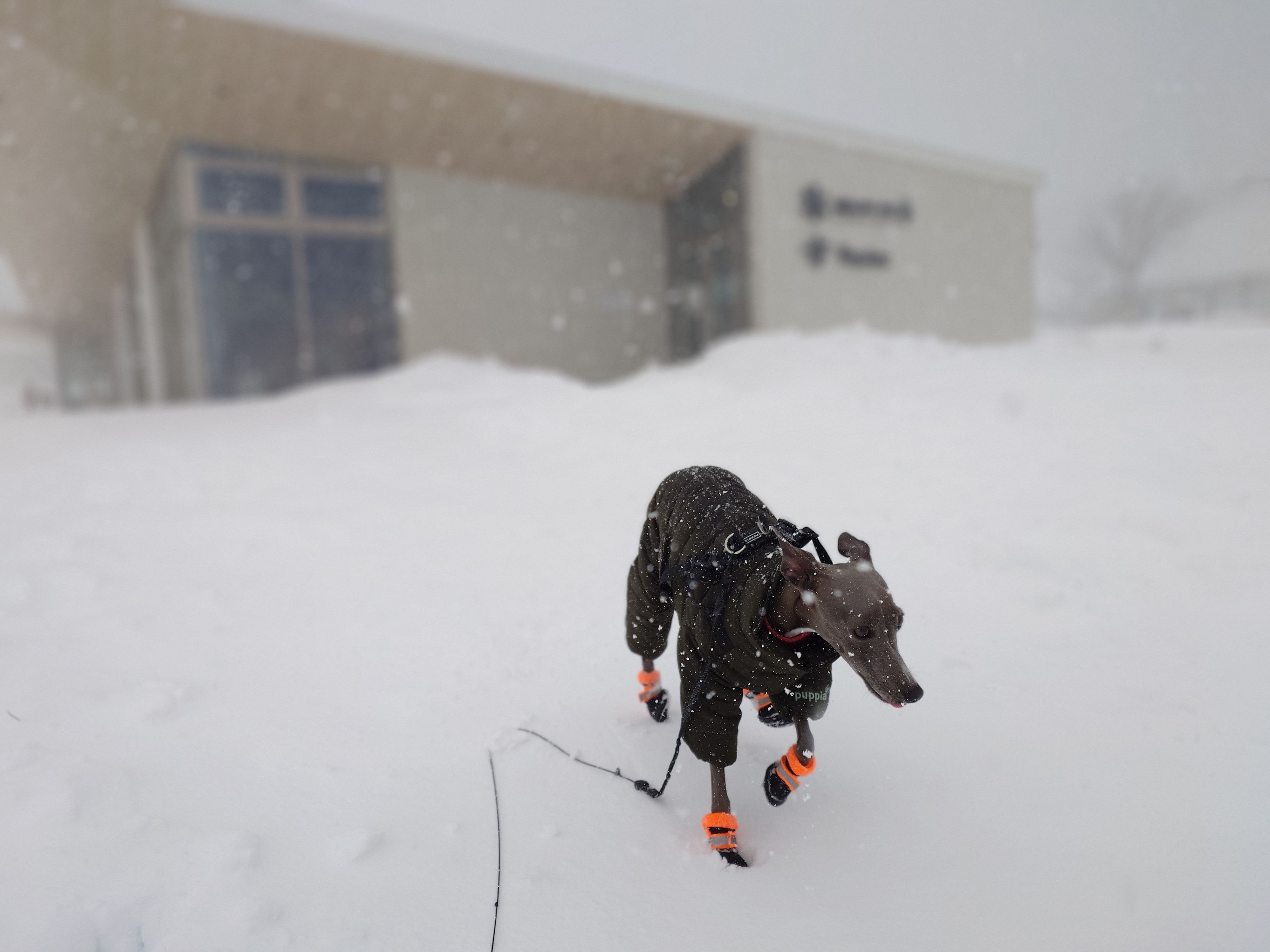 旅行に行った時の1枚。雪や寒さに慣れて楽しみ始めたワンさん!