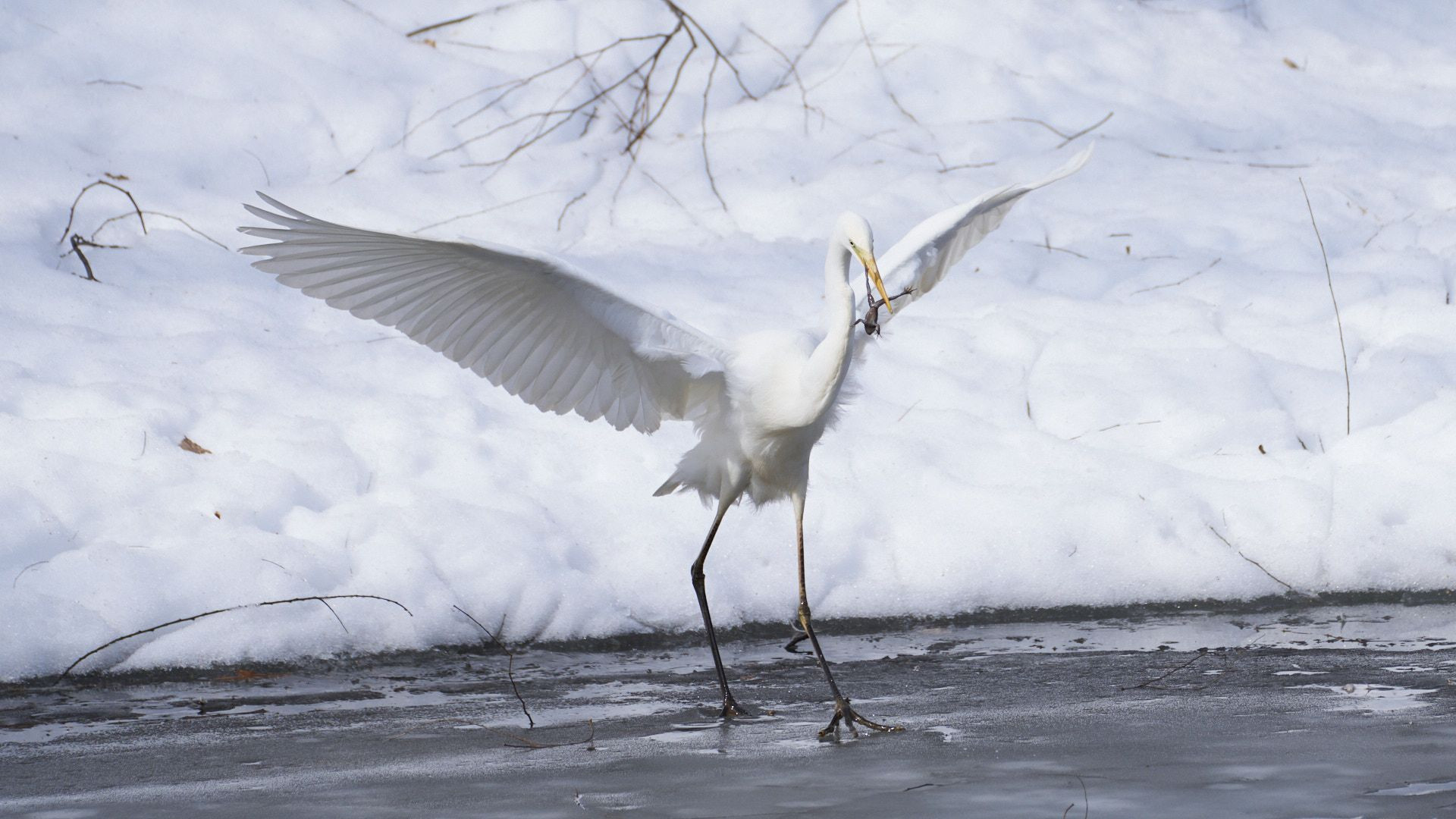 札幌中島公園に現れたダイサギが捕食したところです。池はほぼ凍結しており、わずかに溶けたところでカエルを捕まえ、この後丸呑みしていました。