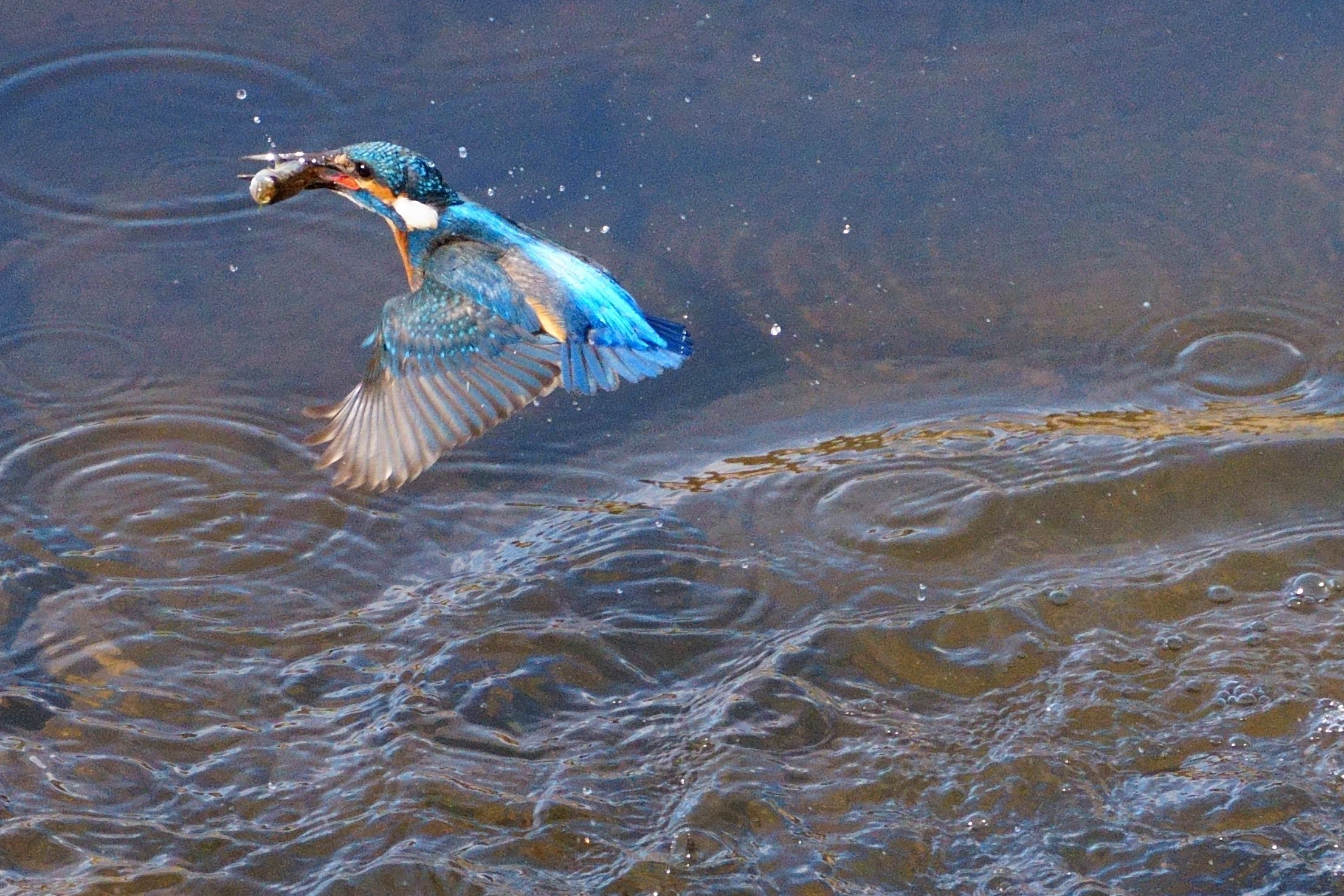 カワセミ エビを咥えて飛翔