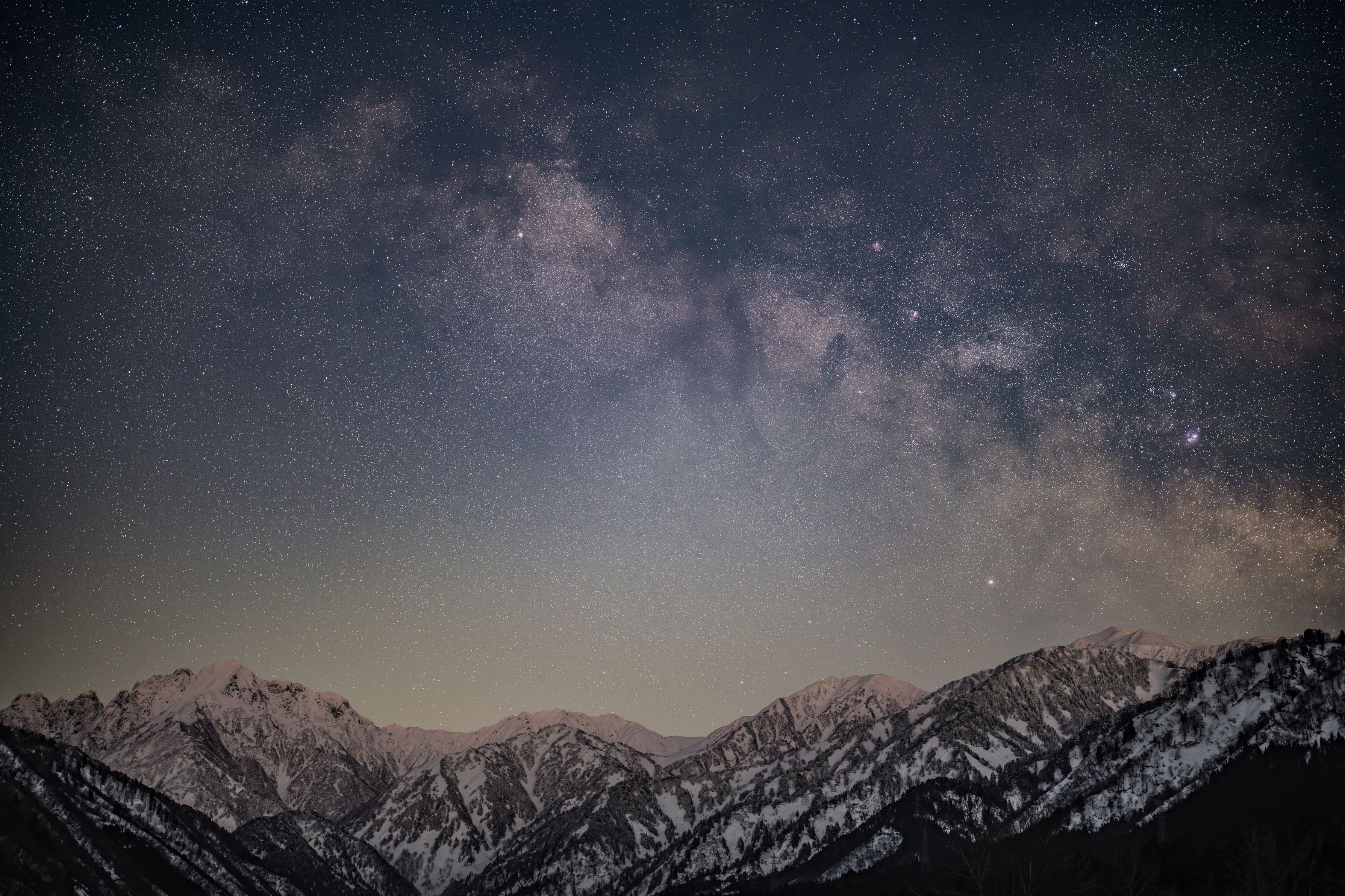 剱岳から南に延びる稜線、その上に展開する天の川は春の風景となります。今作品は前回の投稿時に画像処理に迷ったあげくモノクロで投稿した画像のカラー版です。雪山の雰囲気やら春の銀河の雰囲気を壊さない様にしたつもりです。天の川と言えば天国を想像してしまうのは私だけでしょうか?(笑)。雪山に落ちかけの赤い月光の影響が残っていますが敢えて残しておきました。