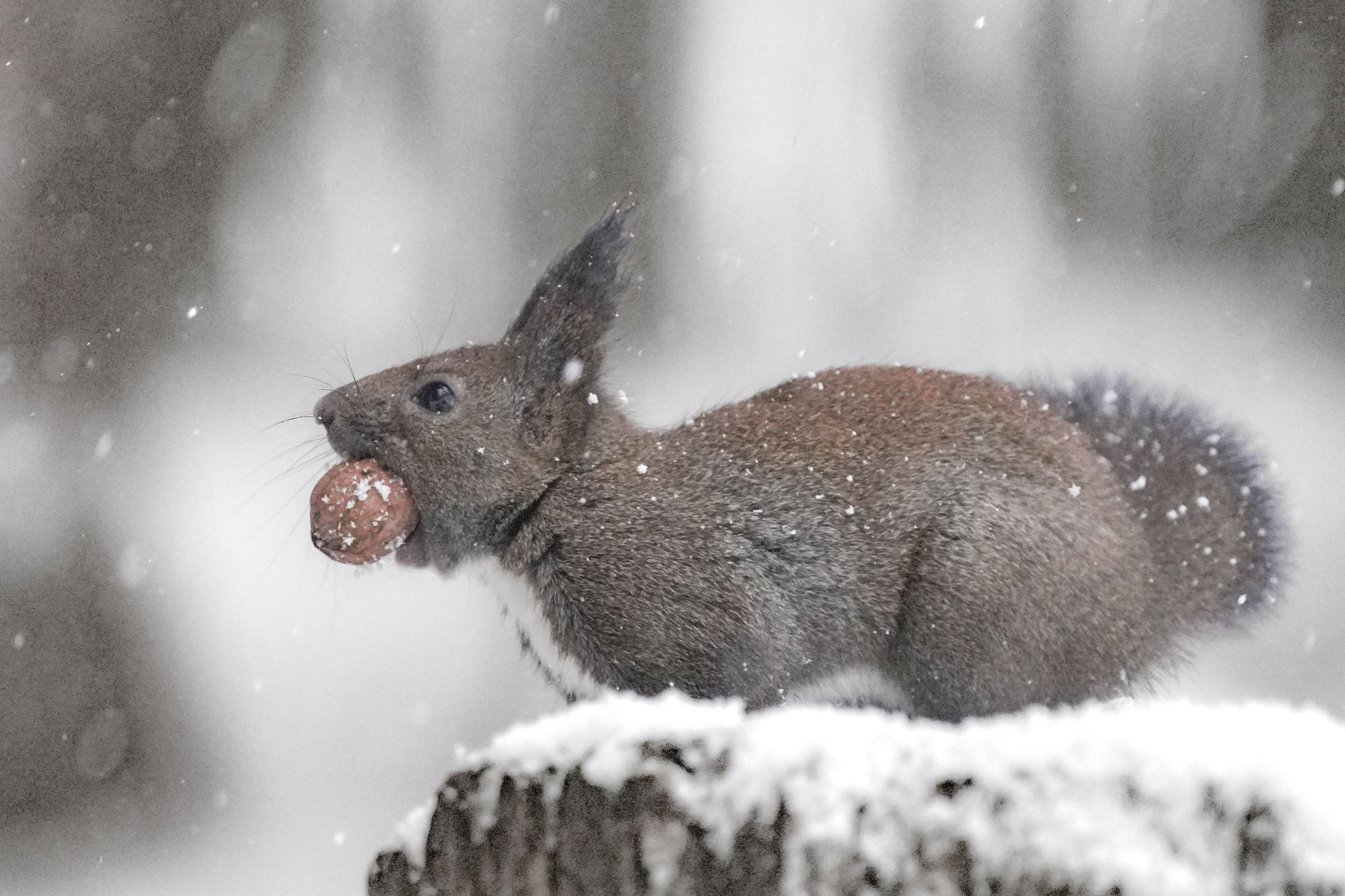 雪の中、クルミをくわえるエゾリスくん。さすがは北海道3大かわいい動物の一つ、可愛い仕草でした。