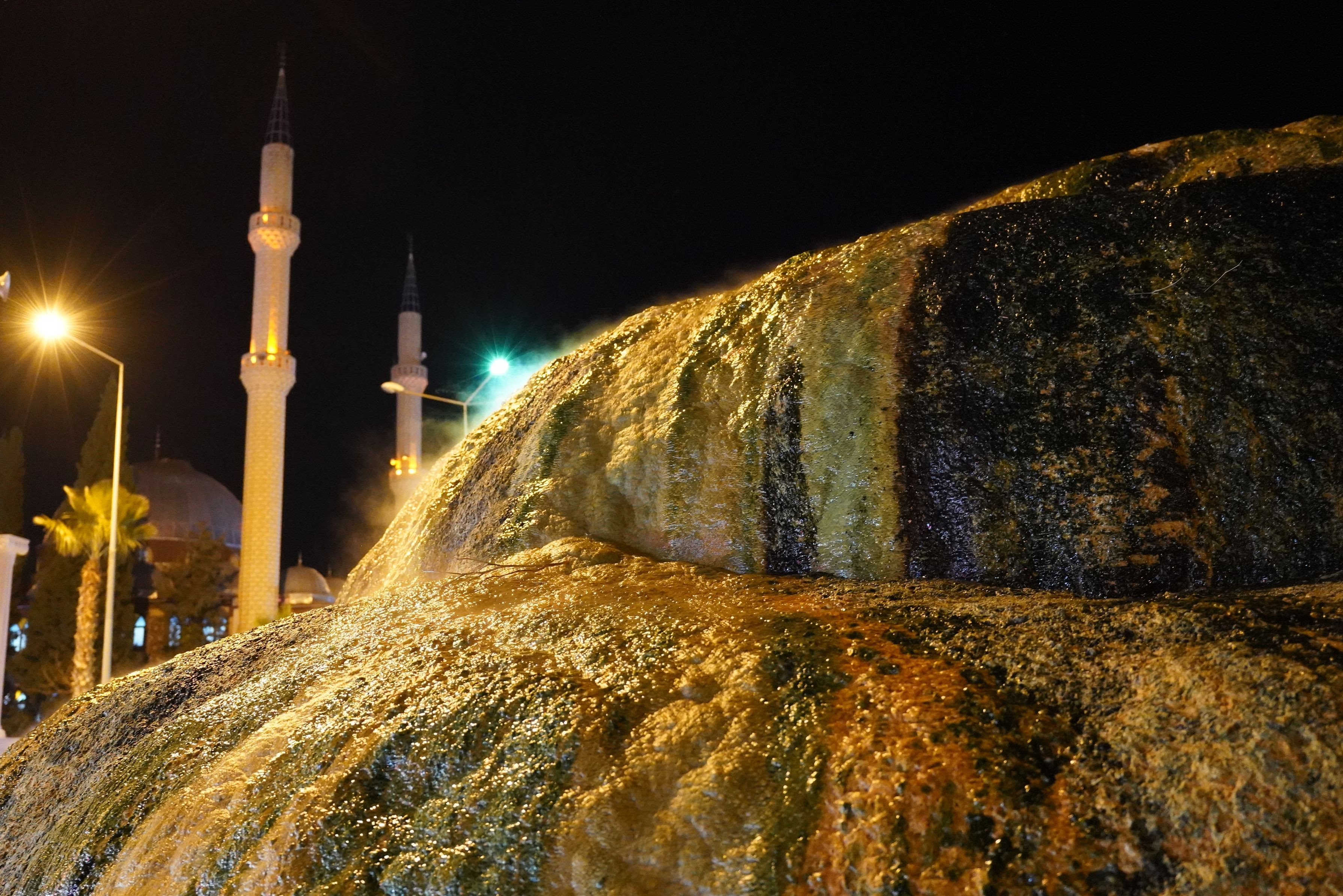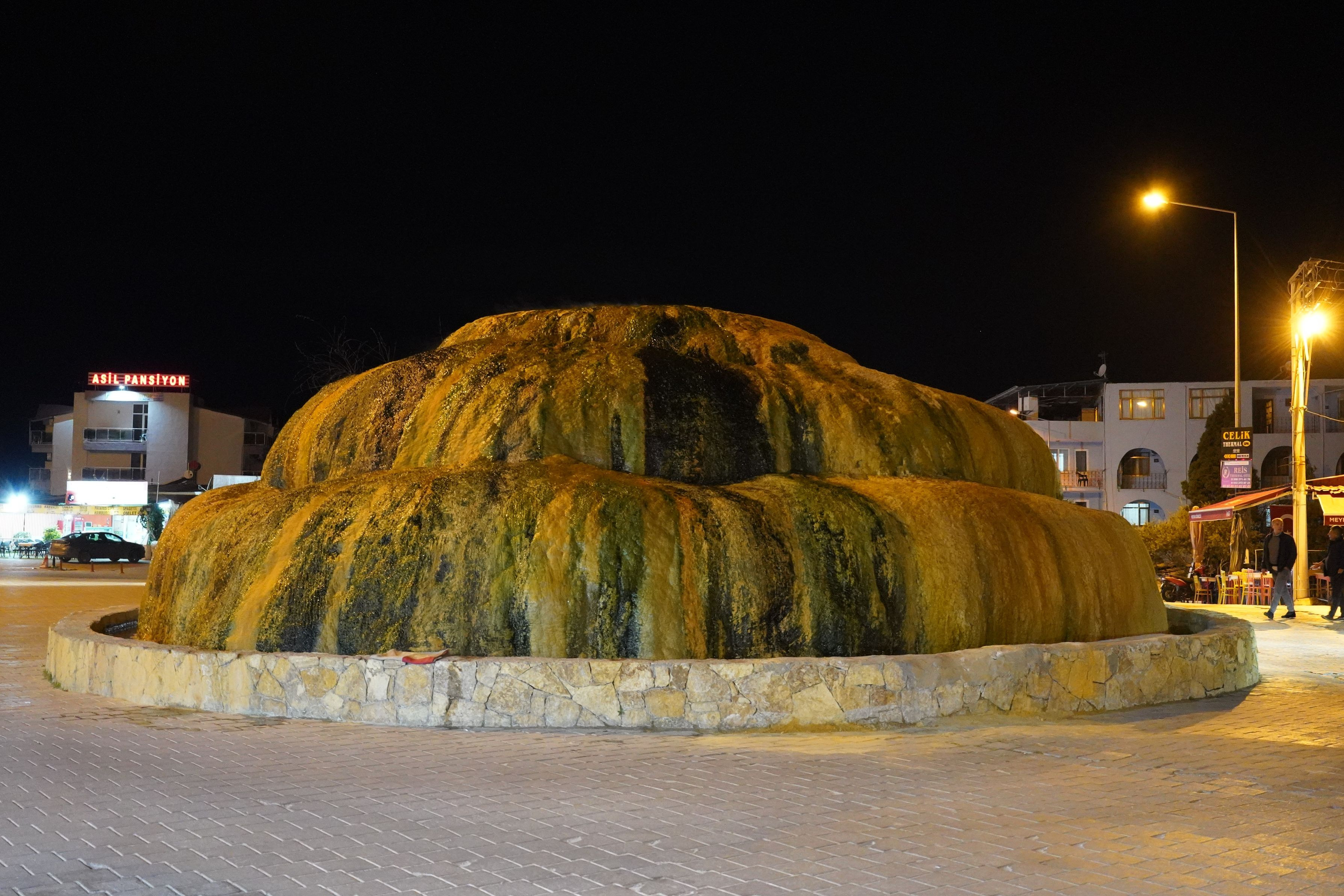 カラハユットは温泉の出る村。 夜、人気のない中心部に行ってみると、何とロータリーの中心に源泉が!
