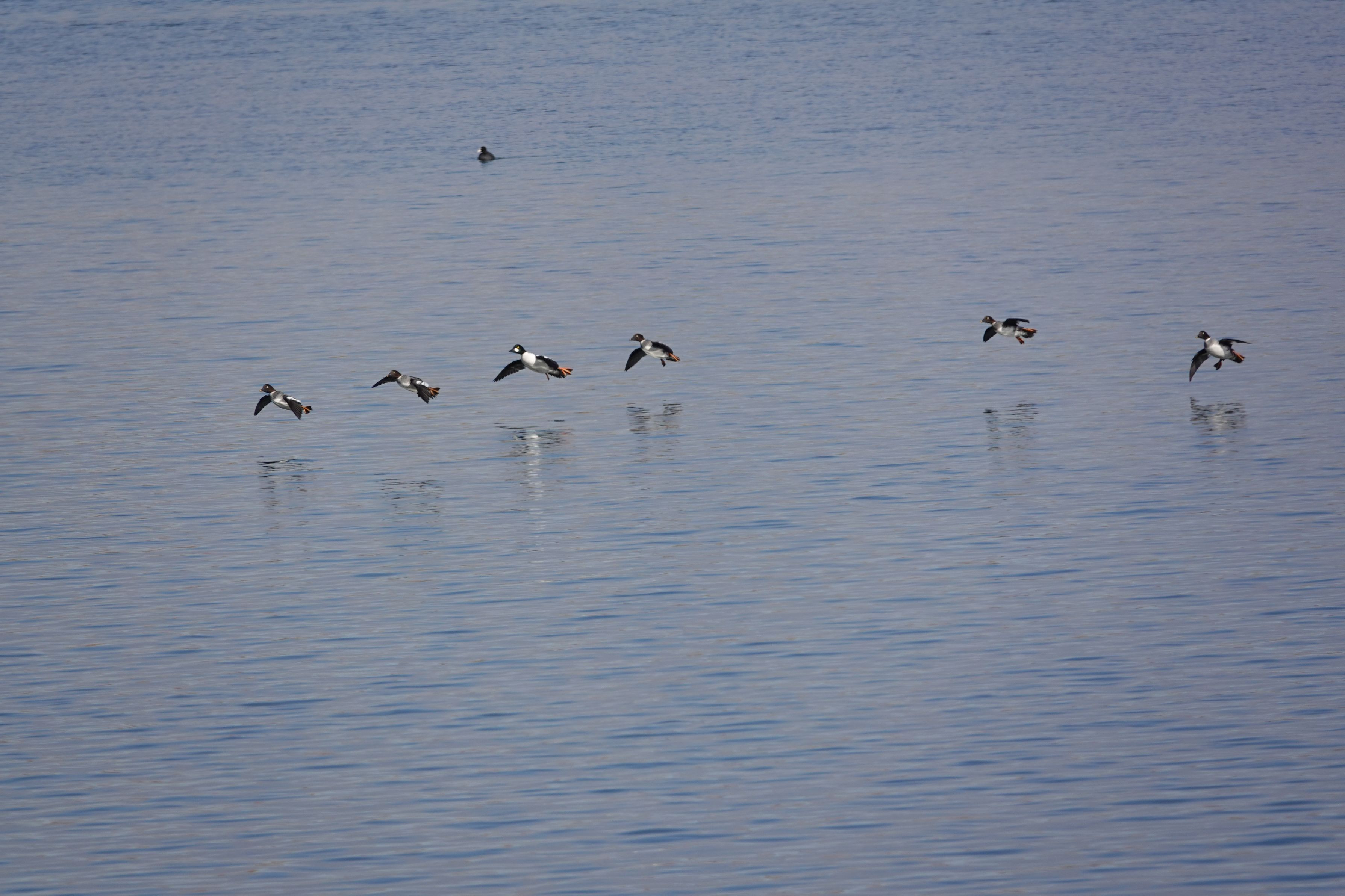 朝焼けにトモエガモ飛ぶ