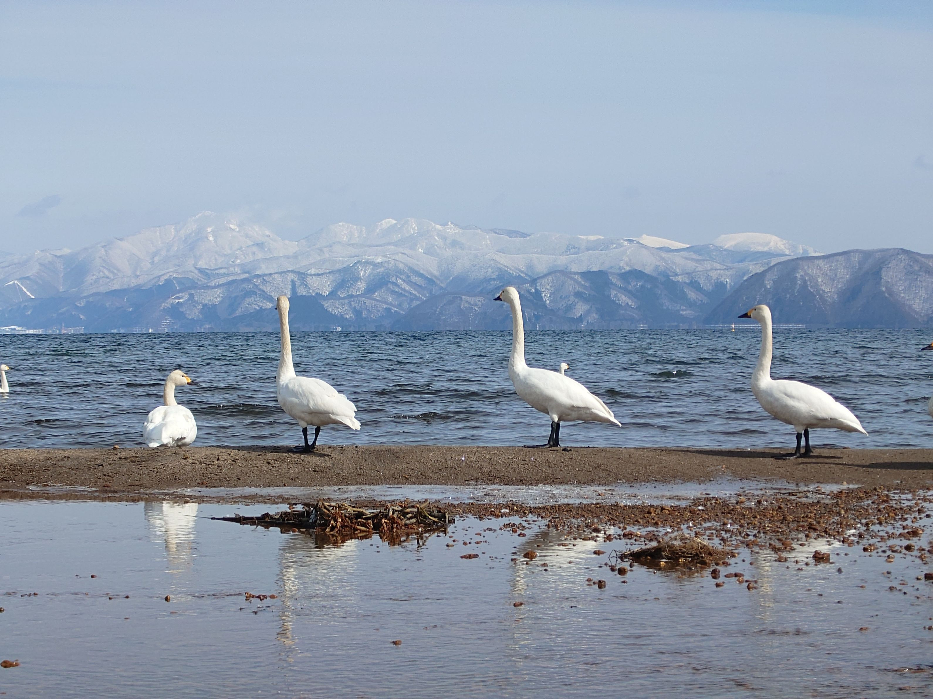 コマ撮り写真のように顔が少しずつ向いている方向が変わっている白鳥さん3羽です。偶然撮影してから気が付きました。奥には安達太良山?が見えています。