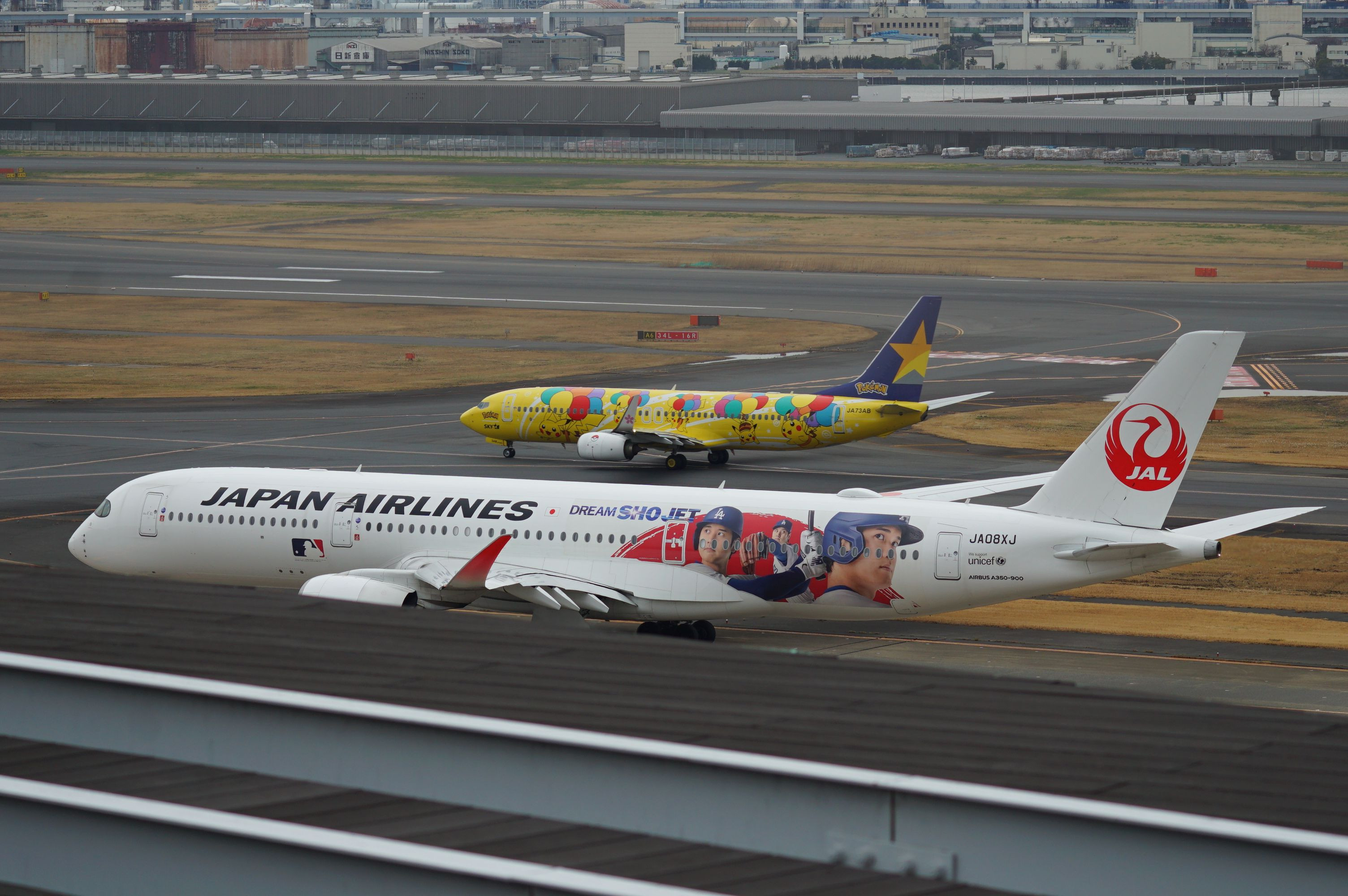 手前に柵が入ってしまっていますが… JALのDream sho jetと、スカイマークのピカチュウジェットが並ぶシーンがあり、咄嗟に撮影。 こういった、塗装機のコラボレーションももっと上手く撮れる機会を増やしていきたいと思いました。