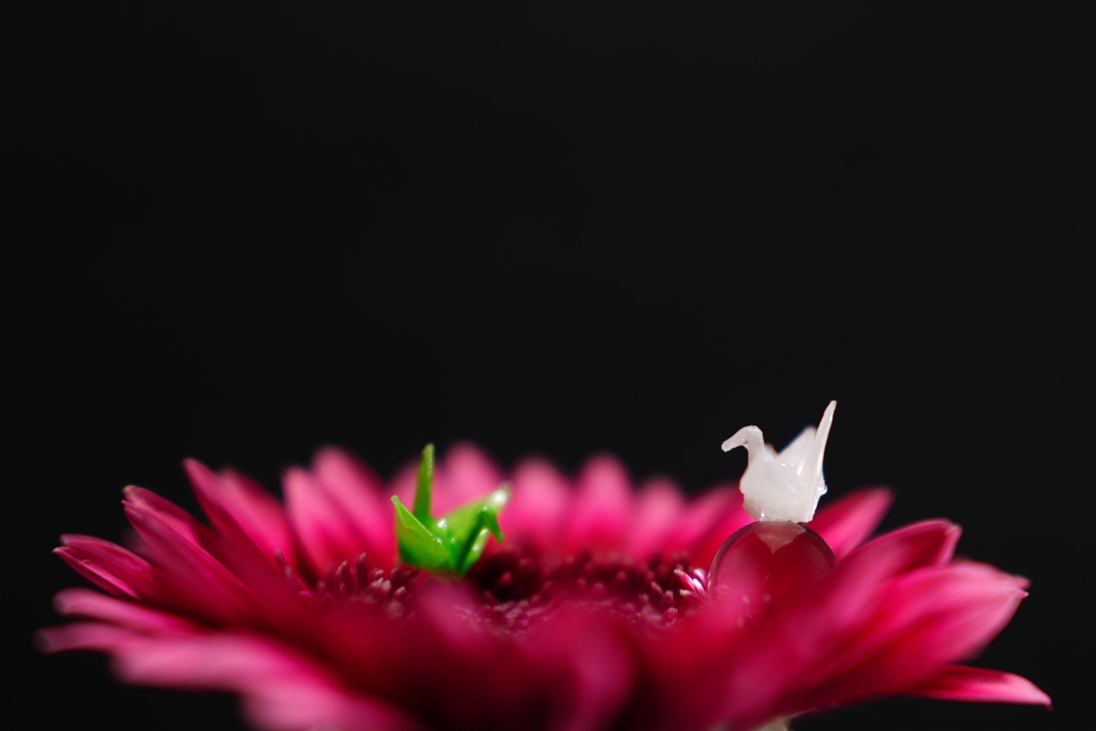サードパーティ製の105mmのマクロレンズを少し前に購入致しました。 その時に家で撮影したものです。 極小の折鶴や滴をガーベラや薔薇と組み合わせて撮影しました。