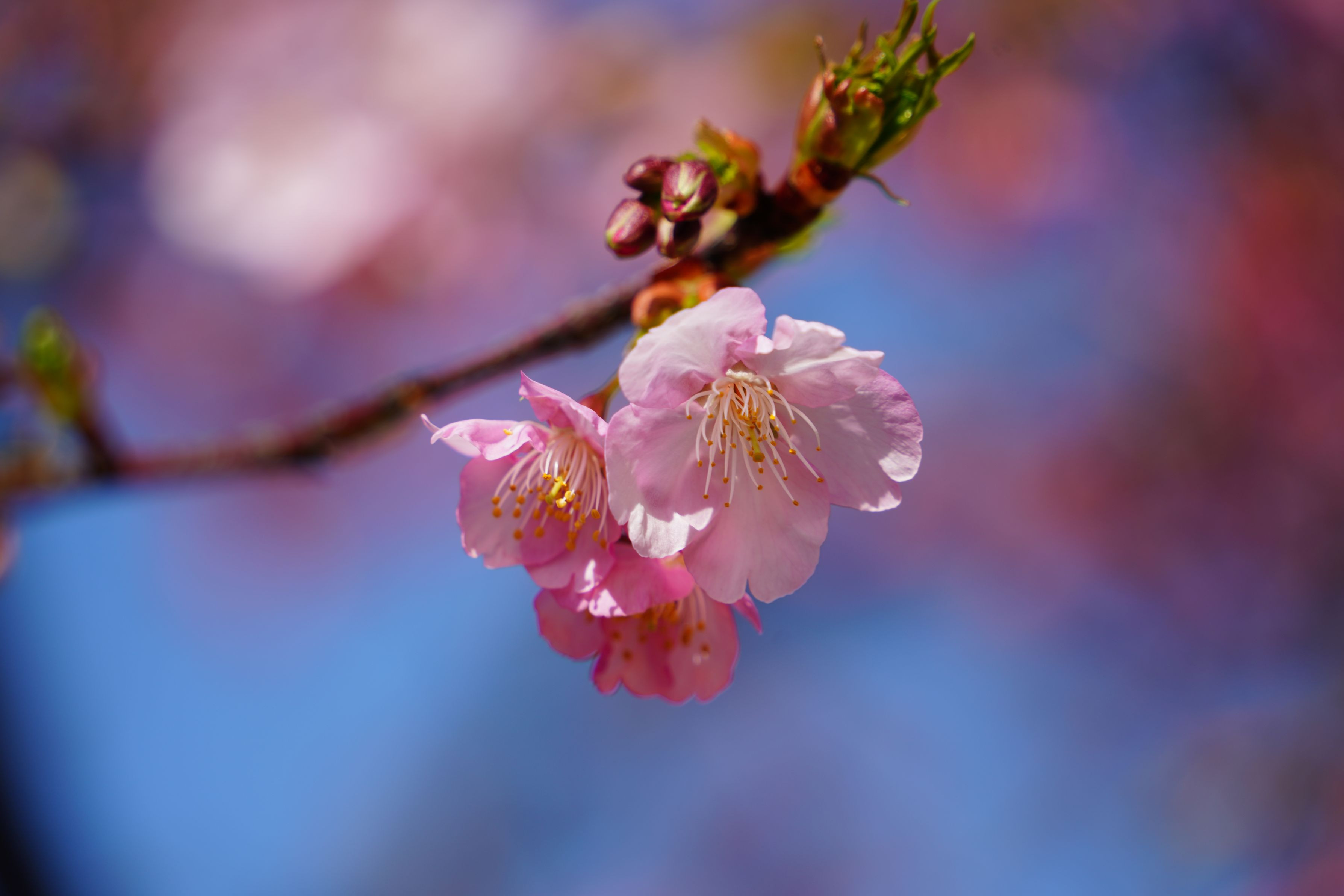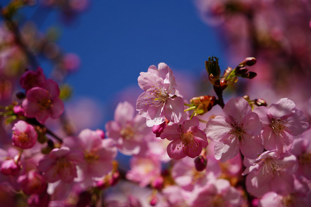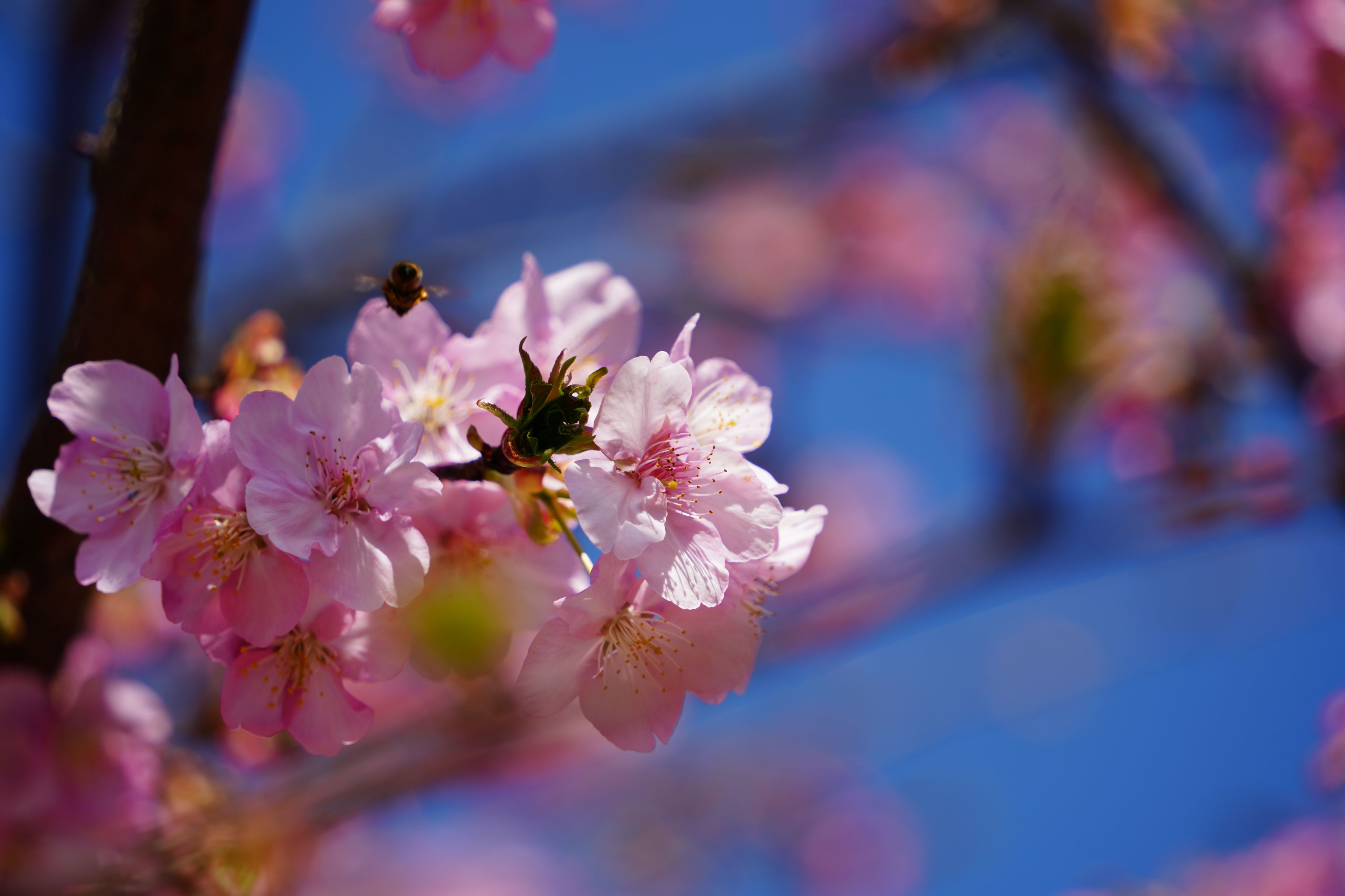 やっとカワズザクラが開花して、ミツバチが多くやってきていました。