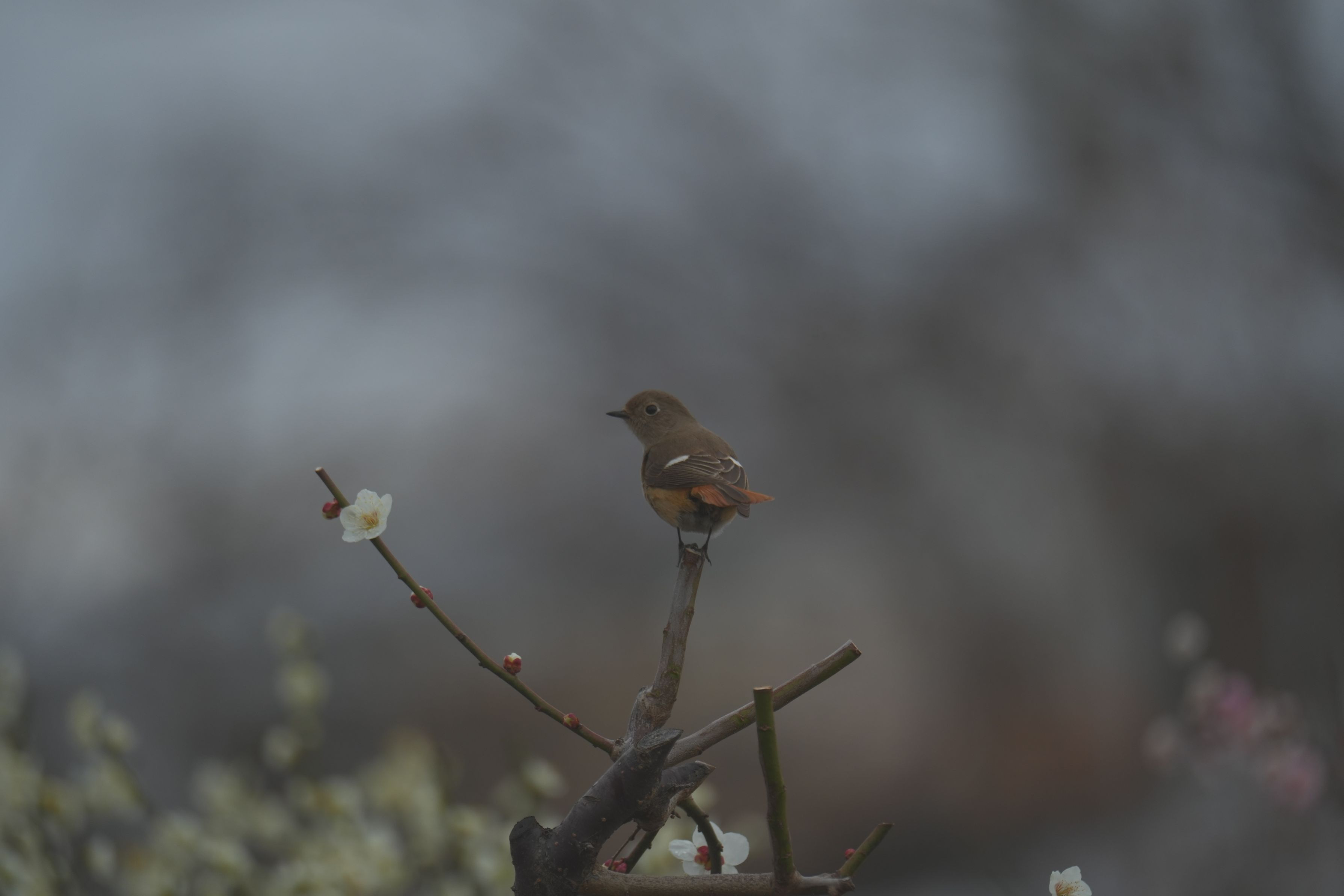 食欲旺盛なジョウビタキくんが珍しく迷っている様です 岐阜県安八百梅園梅祭りにて撮影