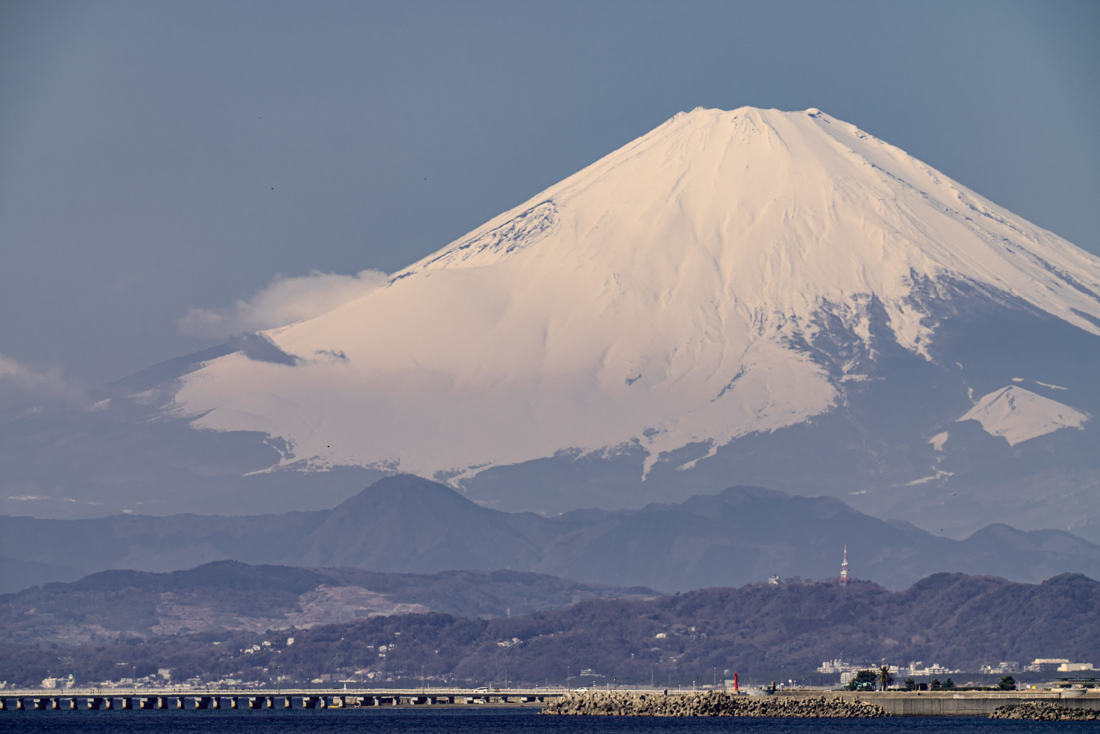 真白き富士!二日前に深く積もった雪だ。 少し霞んで見えるのは、春富士に立つ春霞なのか。 それでも富士山は、白く輝き美しかった。
