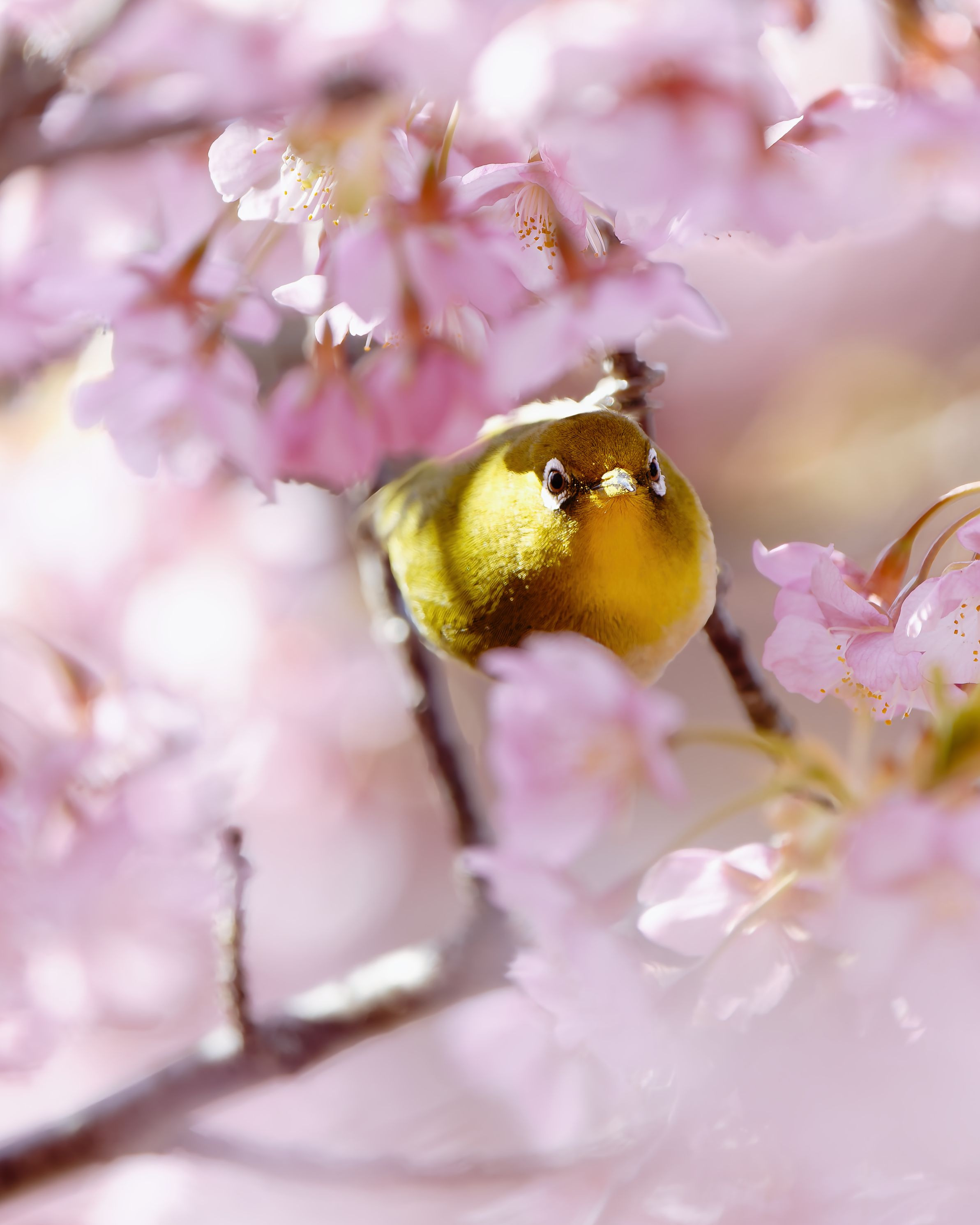 メジロが蜜を吸いに来たところ、カメラ目線の絵が撮れました